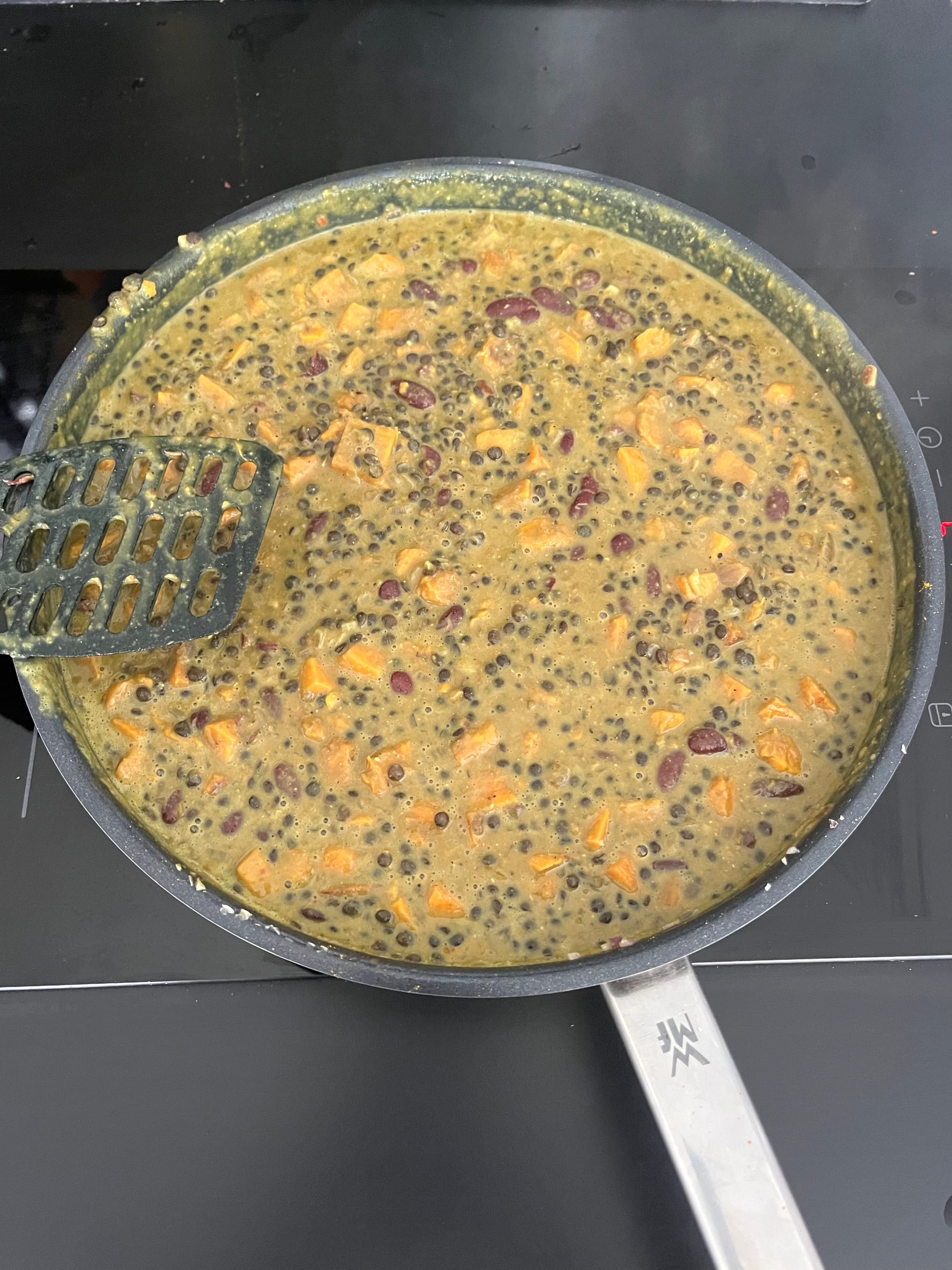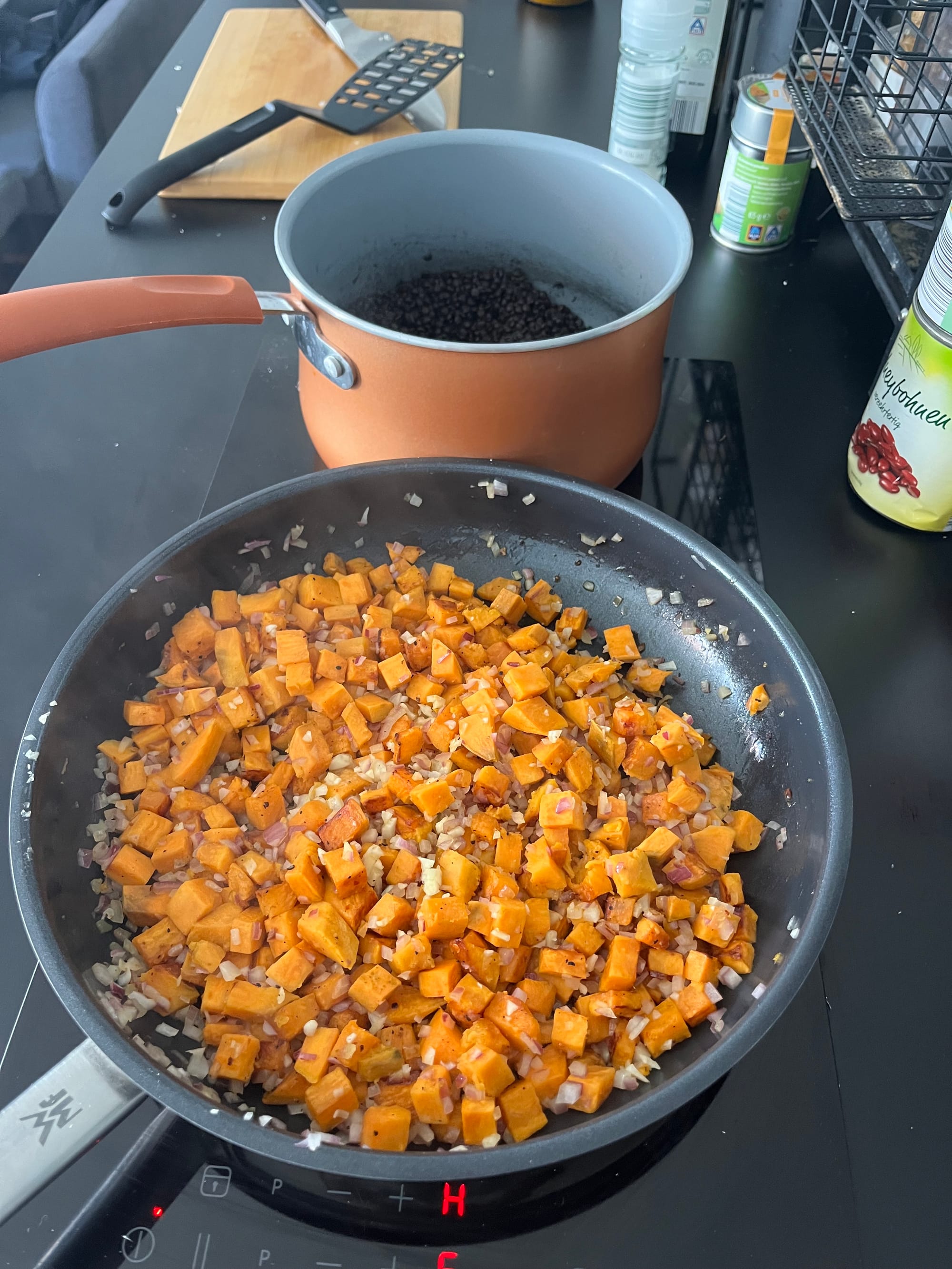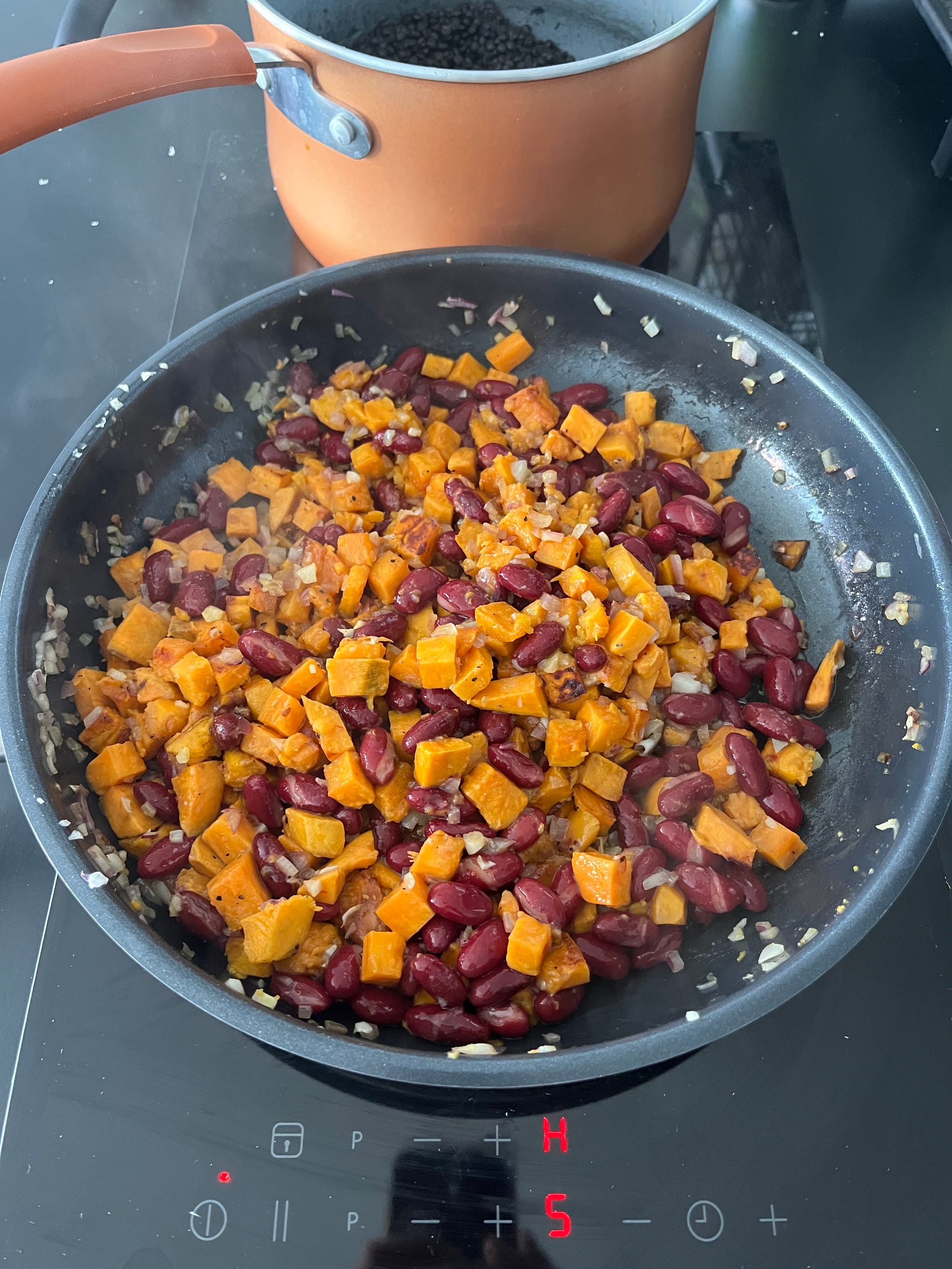 Süßkartoffeln mit Knoblauch und Zwiebeln anbraten. Optional können die Süßkartoffeln auch separat angebraten und später hinzugefügt werden. Die Linsen kochen. Tomatenmark an der Seite in der Pfanne anrösten und Olivenöl hinzufügen. Kidneybohnen und Linsen zugeben.