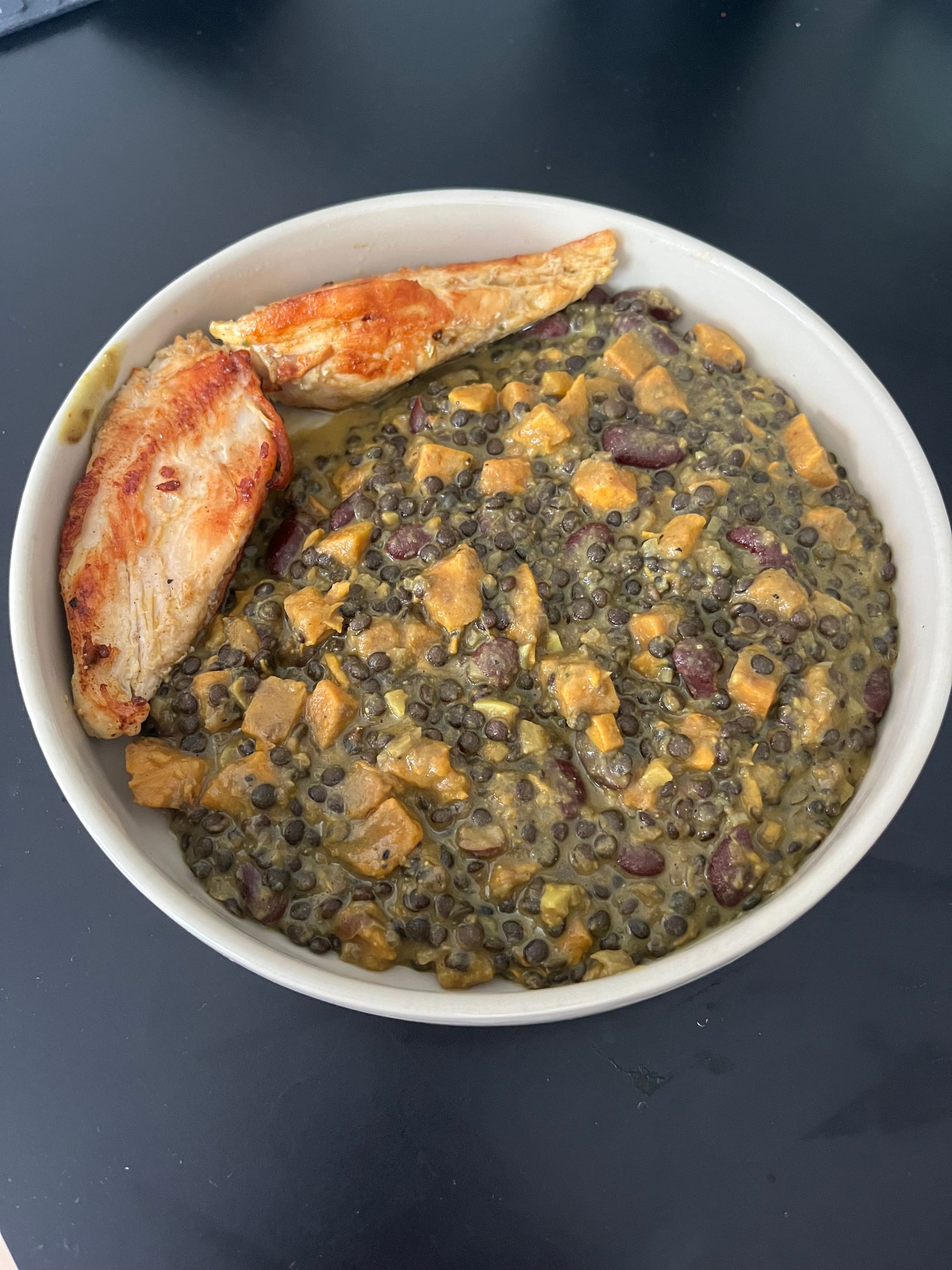 Beluga Linsen-Curry mit Süßkartoffel und Hähnchen