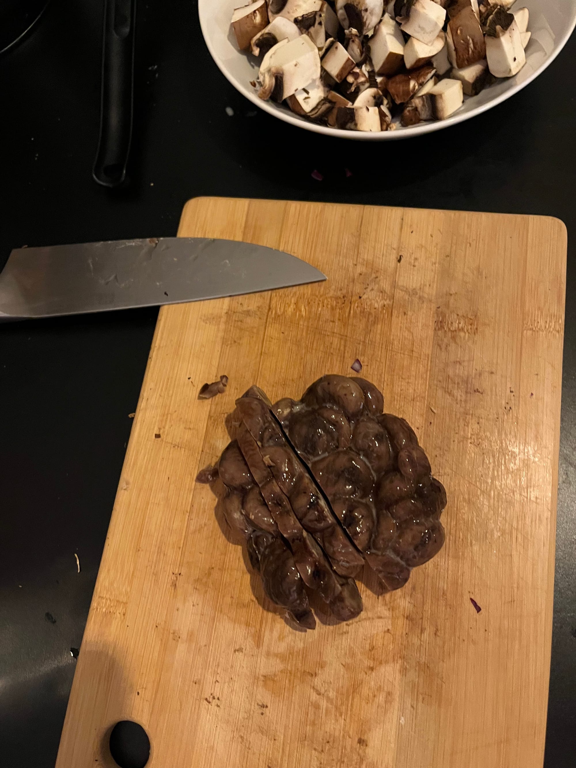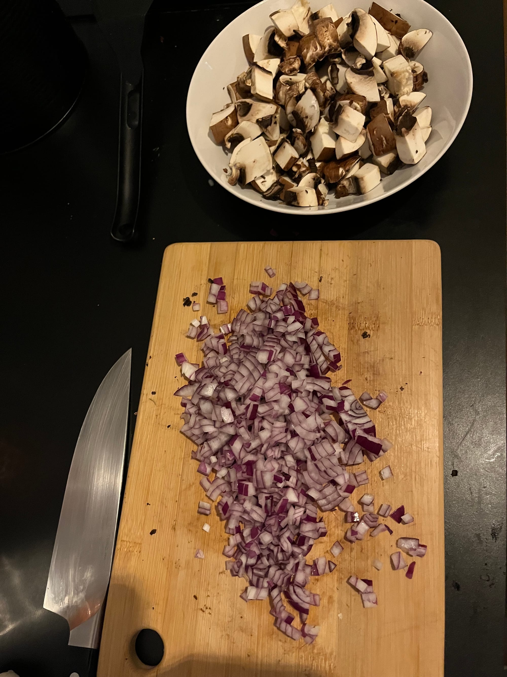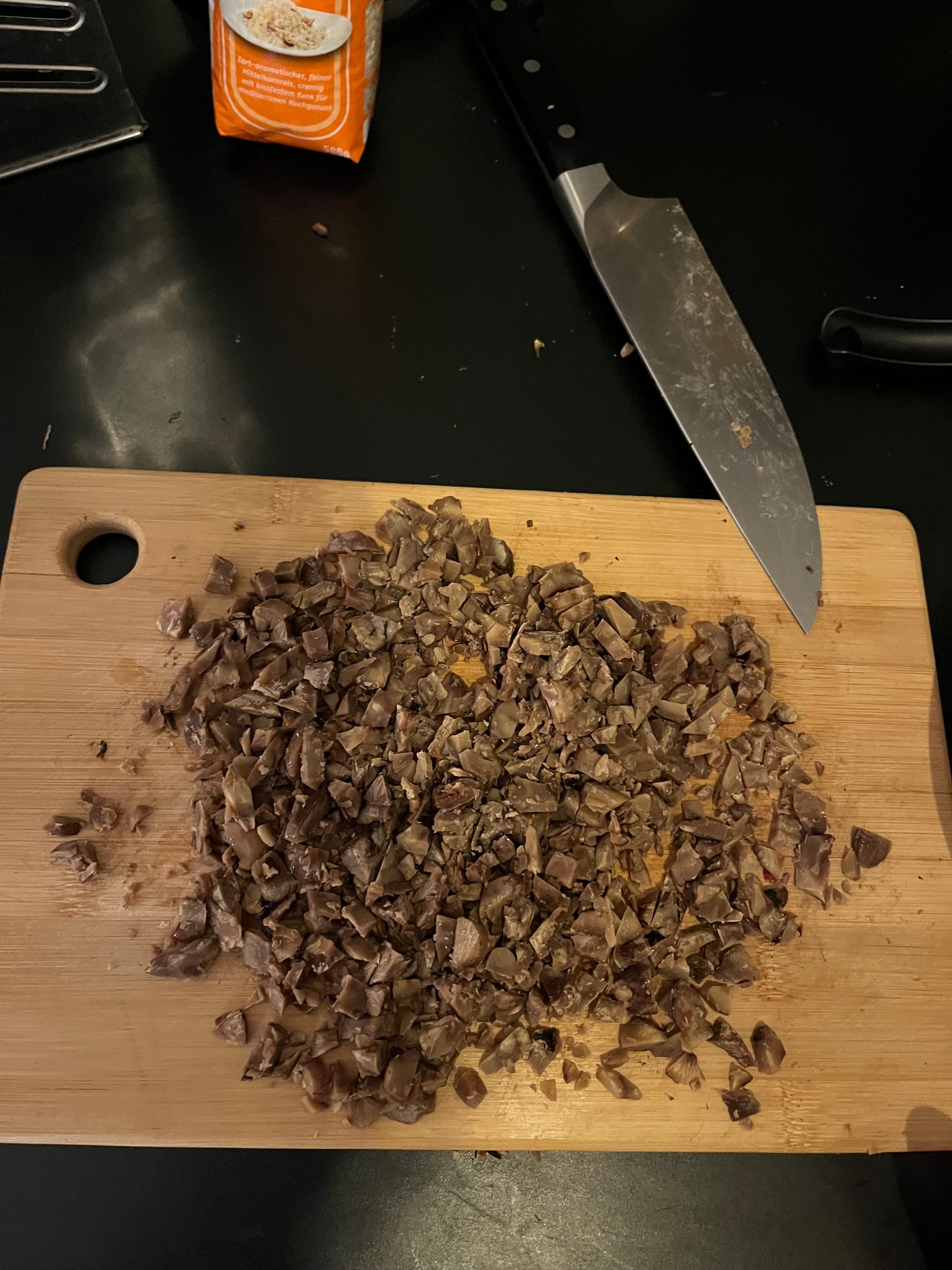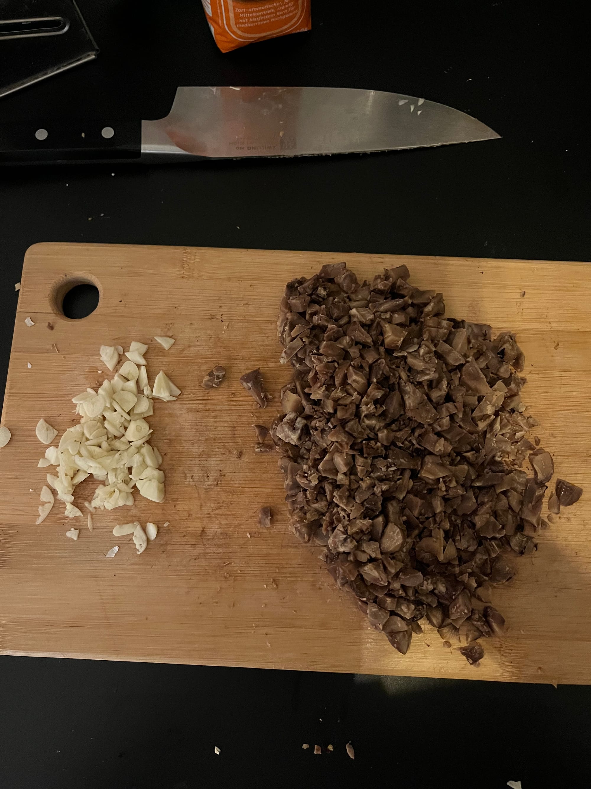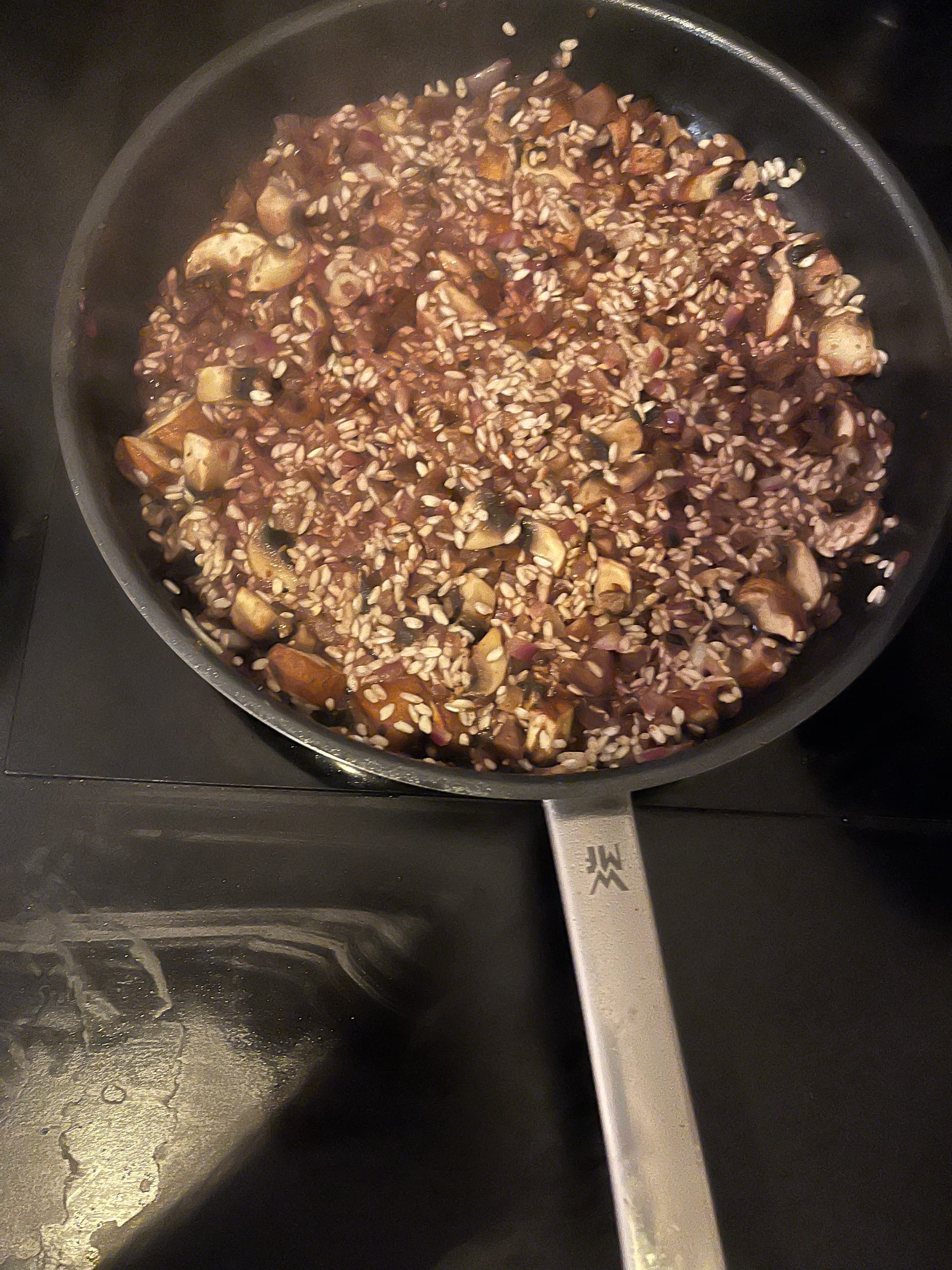Zuerst werden die Zwiebeln, der Knoblauch, die Pilze und die Maronen geschnitten. Ich brate bei dieser Kombinationen immer zuerst die Zwiebeln kurz an und werfe nach 1–2. min. den Rest hinterher. Wenn alles bereits leicht angebraten ist, kommt der Reis mit einem kleinen Stück Butter hinzu. Sobald dieser glasig ist, wird alles mit Rotwein abgelöscht. Parallel dazu, koche ich meine Gemüsebrühe. Sobald der Rotwein größtenteils von den Zutaten aufgenommen wurde, gebe ich nach und nach Gemüsebrühe hinzu. Ganz zum Schluss werfe ich noch ein Stück Butter hinzu und gebe nach und nach einiges an Parmesan hinzu. Der letzte Schritt, für die perfekte cremige Konsistenz, ist ein kleiner Schuss Sahne. Dann wird serviert.