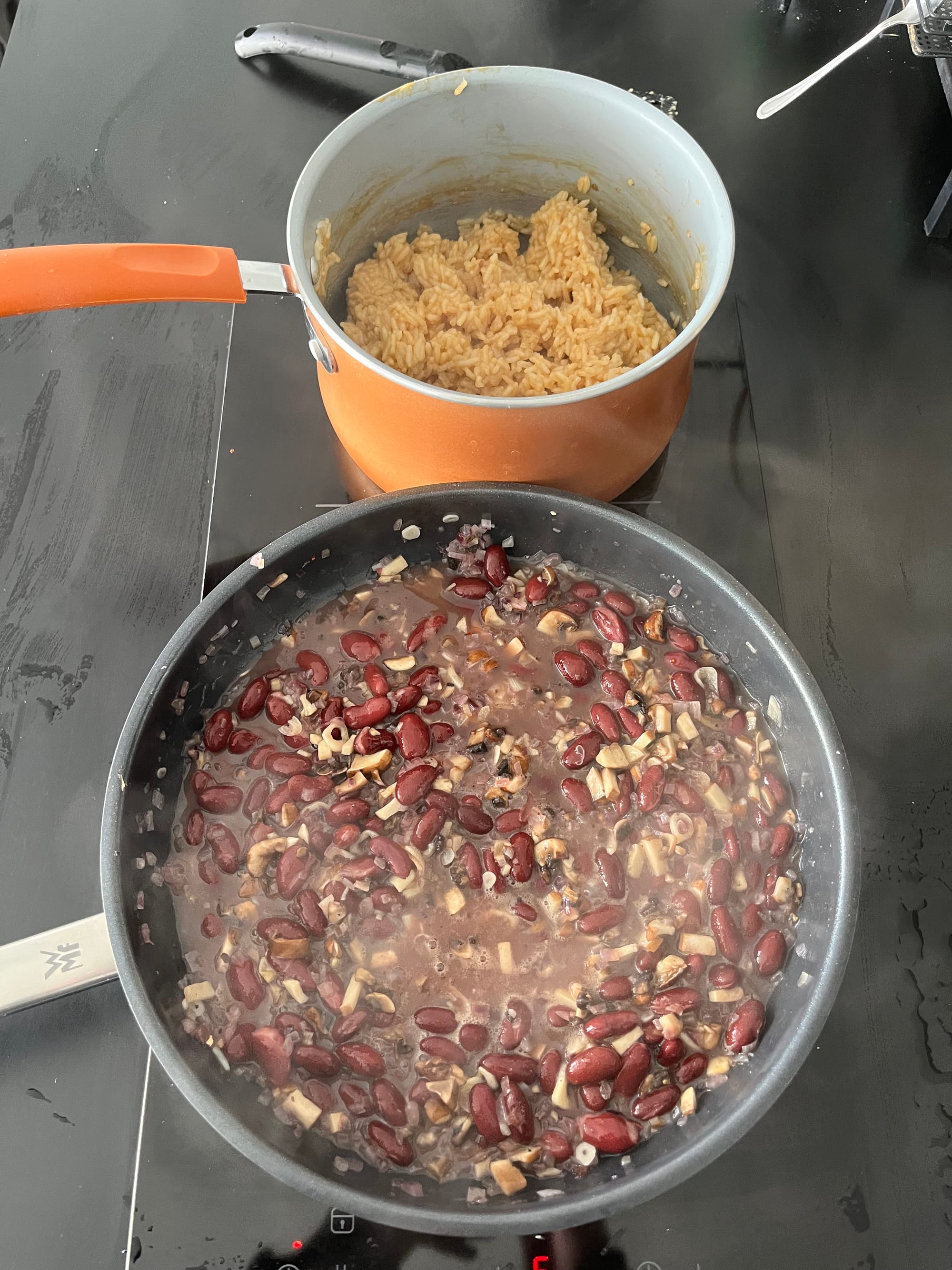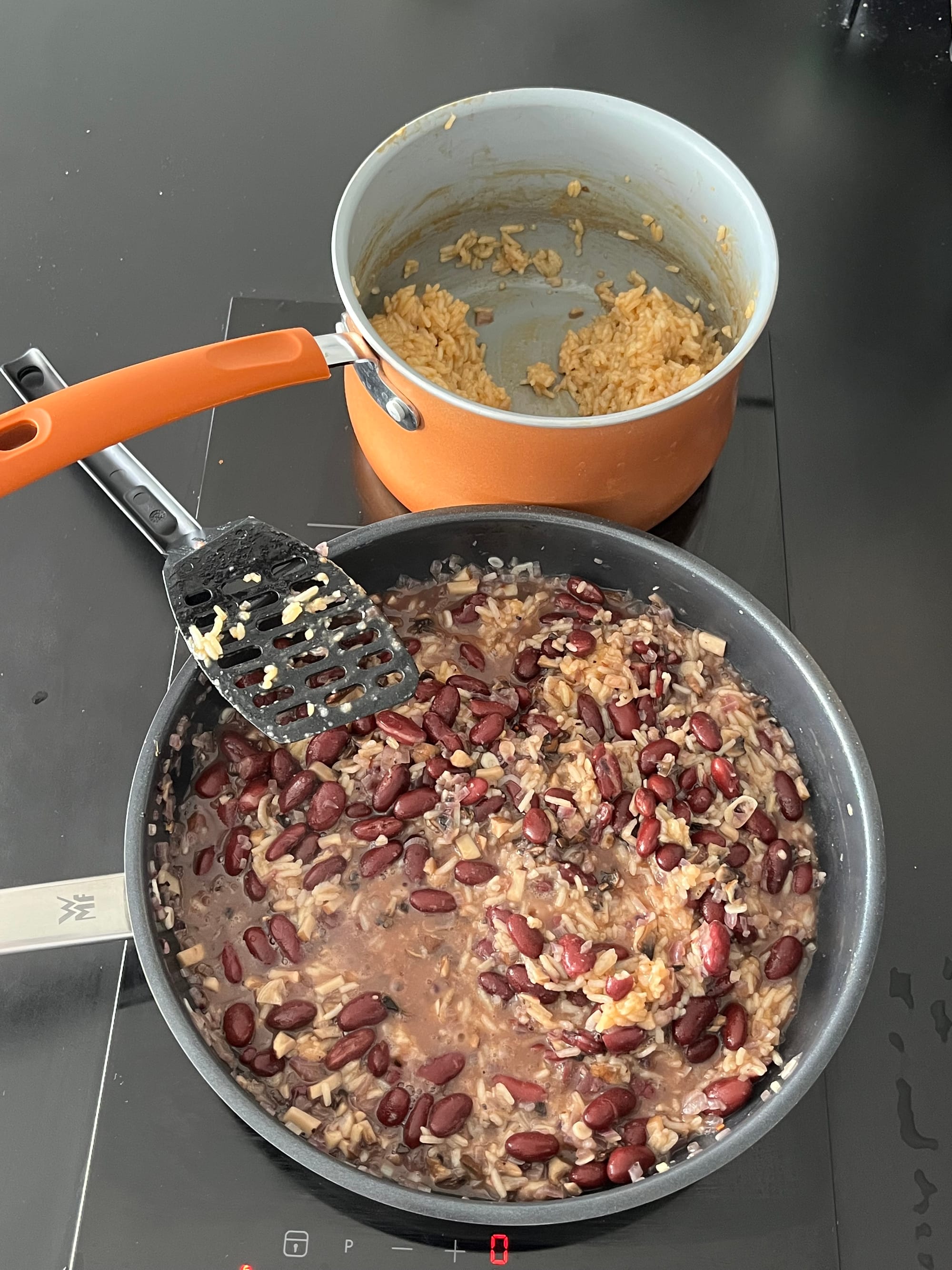 Der erste Schritt ist, die Bohnen mit etwas Salz, Pfeffer, Knoblauch und Zwiebeln anzubraten. Parallel dazu kochen wir den Reis. Sobald der Reis fertig ist, fügen wir Sojasauce und Reisessig hinzu. Anschließend geben wir die Sauce aus der Bohnendose zu den Bohnen und rühren den Reis schrittweise unter. Nach Bedarf können Chiliflocken hinzugefügt werden. Den gesamten Mix lassen wir dann einen Tag ruhen.