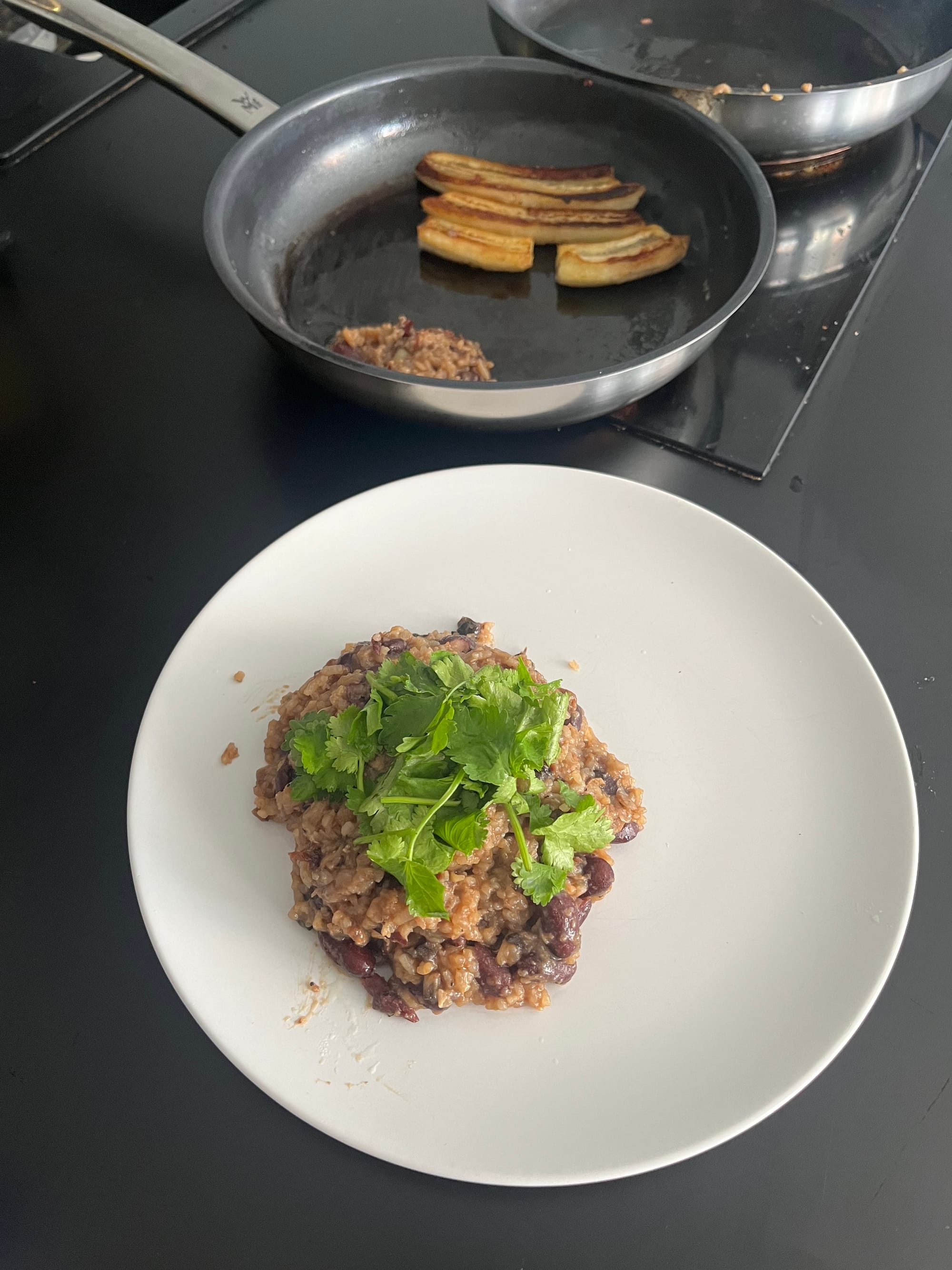 Ich achte darauf, den Reis und die Bohnen parallel zuzubereiten. So kann ich nach und nach die Sauce, die bereits in der Bohnendose enthalten ist, dem Reis hinzufügen. Zuerst habe ich den Reis leicht gesalzen und Reisessig sowie Sojasauce hinzugegeben. Die Bohnen habe ich zuvor mit Knoblauch und Zwiebeln kurz angebraten, bevor ich den Bohnensaft hinzugefügt habe. Anschließend habe ich die Mischung einen Tag stehen lassen, damit die Flüssigkeit schön in Reis und Bohnen einziehen kann und zu einem einzigartigen Geschmack führt. Zum Schluss habe ich Koriander über den Reis gestreut und Petersilie über das Spiegelei gegeben. Die Petersilie würde ich nächstes Mal weglassen.