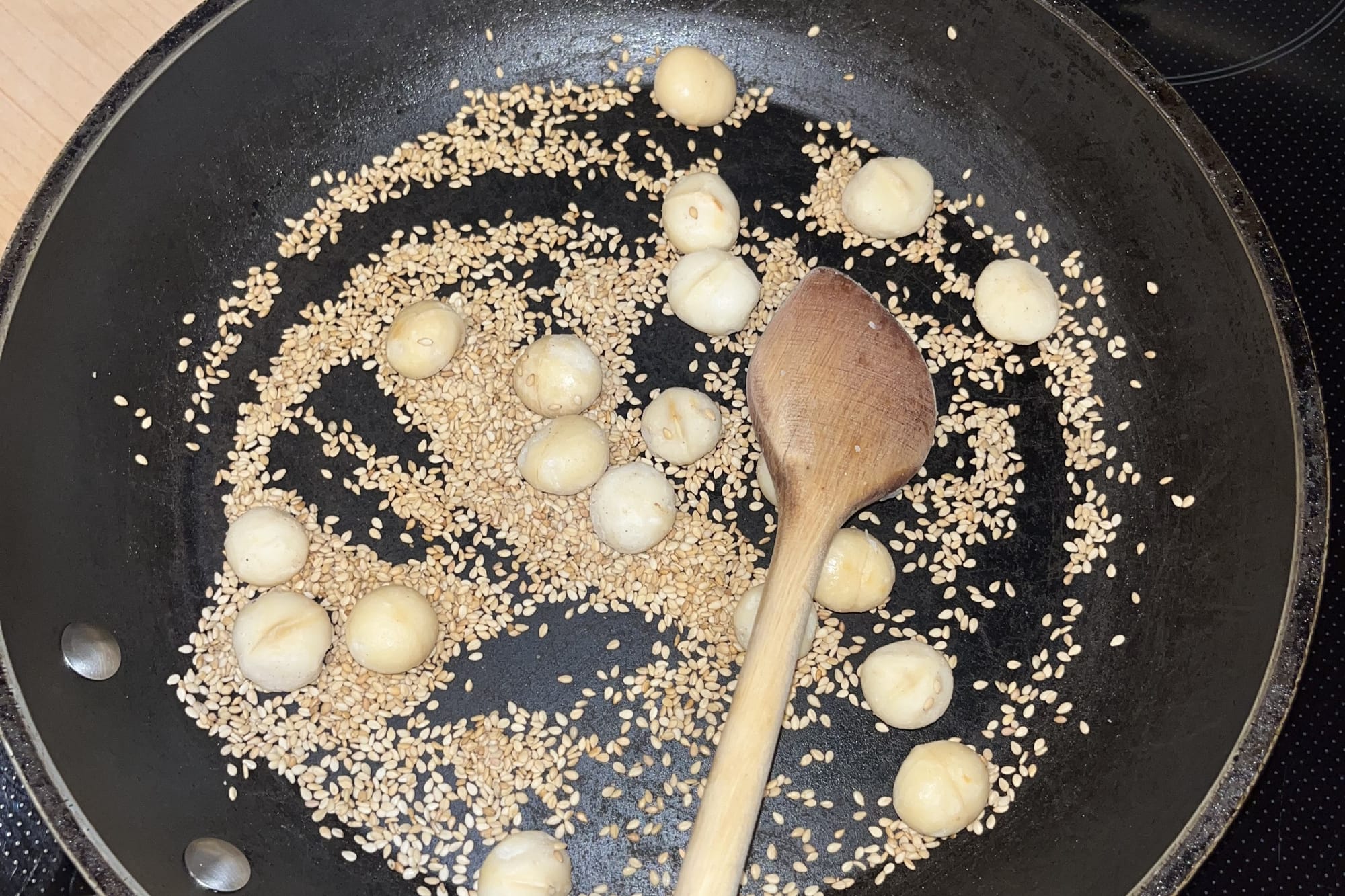 Slice spring onions into fine rings, finely dice onion, and cut Nori into thin strips. Toast sesame seeds in a hot pan without oil for 3 minutes. Remove from the pan, then roast the macadamia nuts in the same pan for 3 minutes.