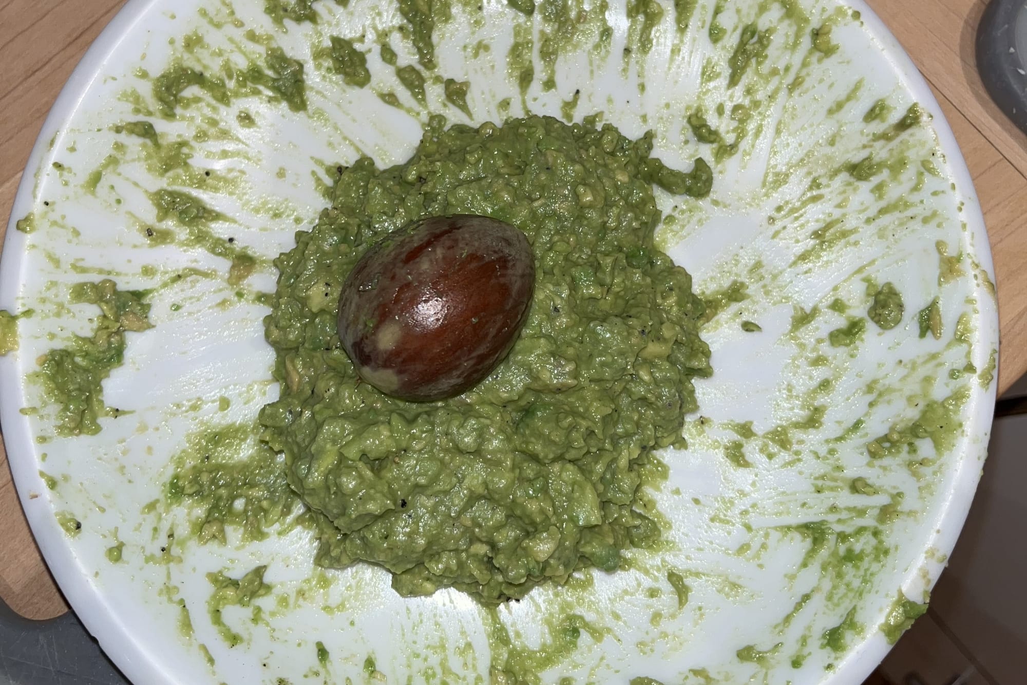 Puree avocado with rice vinegar until smooth. For the dressing, mix all ingredients together.