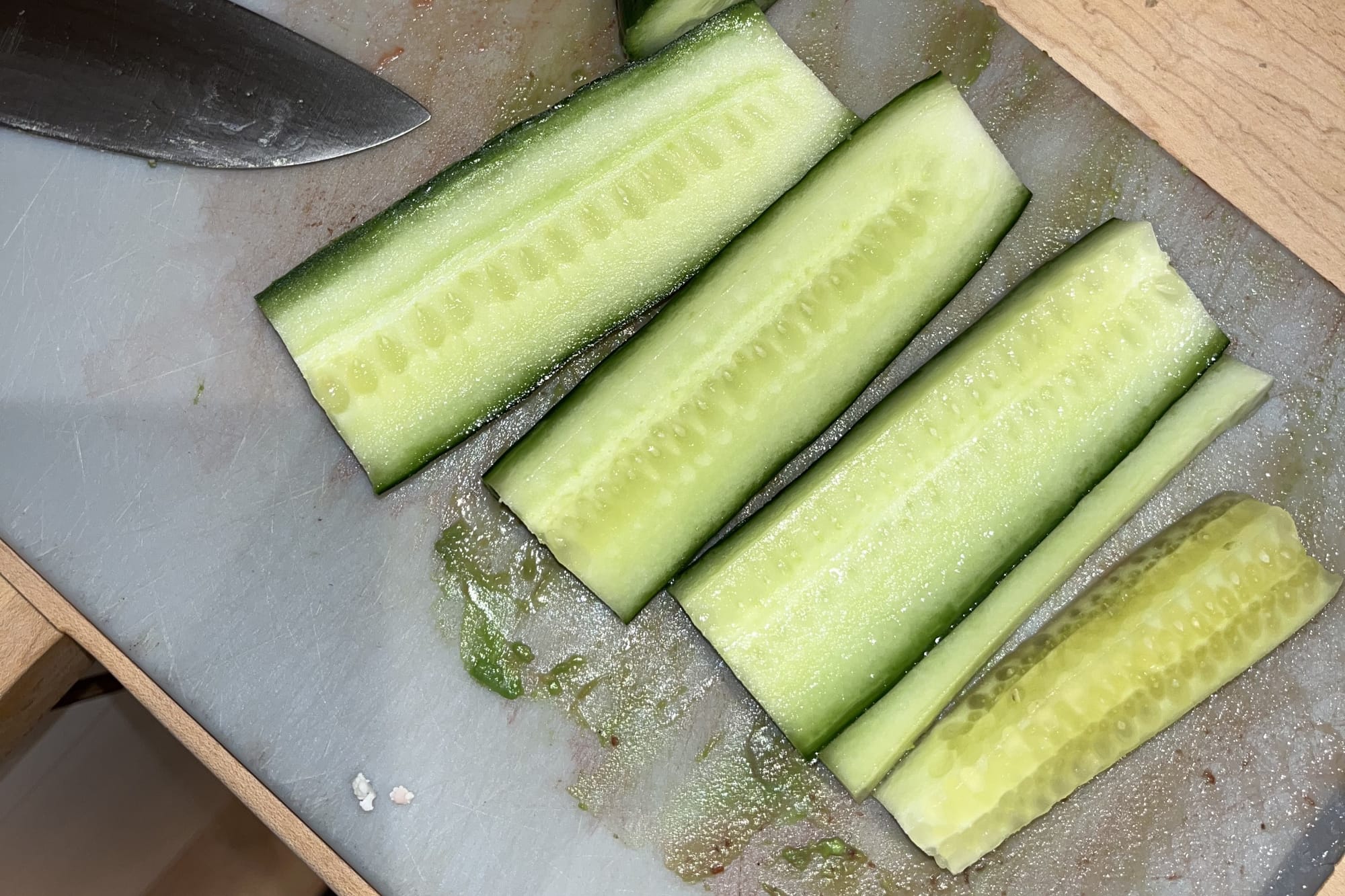 Steam edamame for 5 minutes, then rinse under cold running water. Slice cucumber into thin slices.