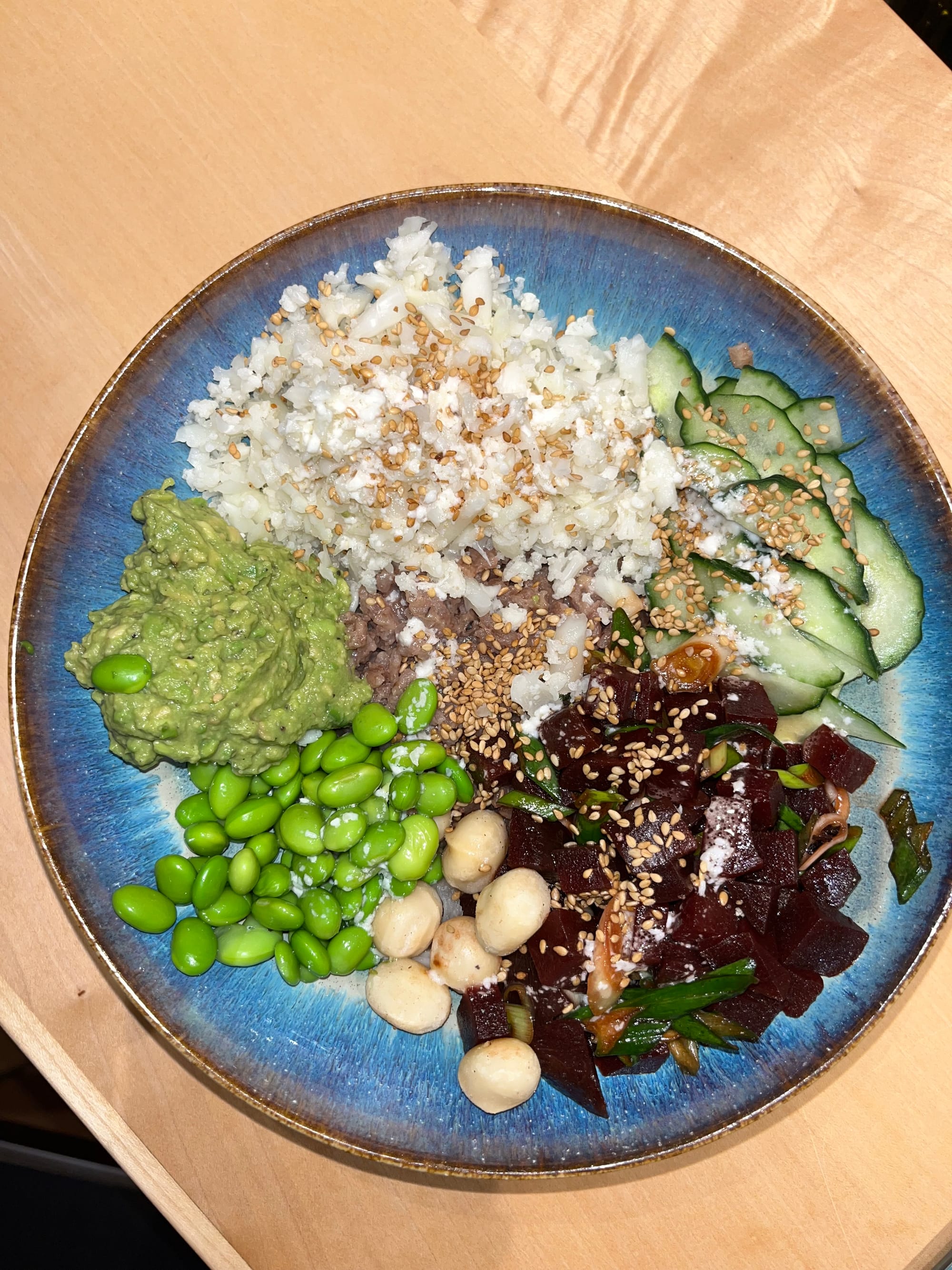 Healthy & flavourful beetroot poke bowl w/ cauliflower. The perfect meal for a satisfying sense of well-being.