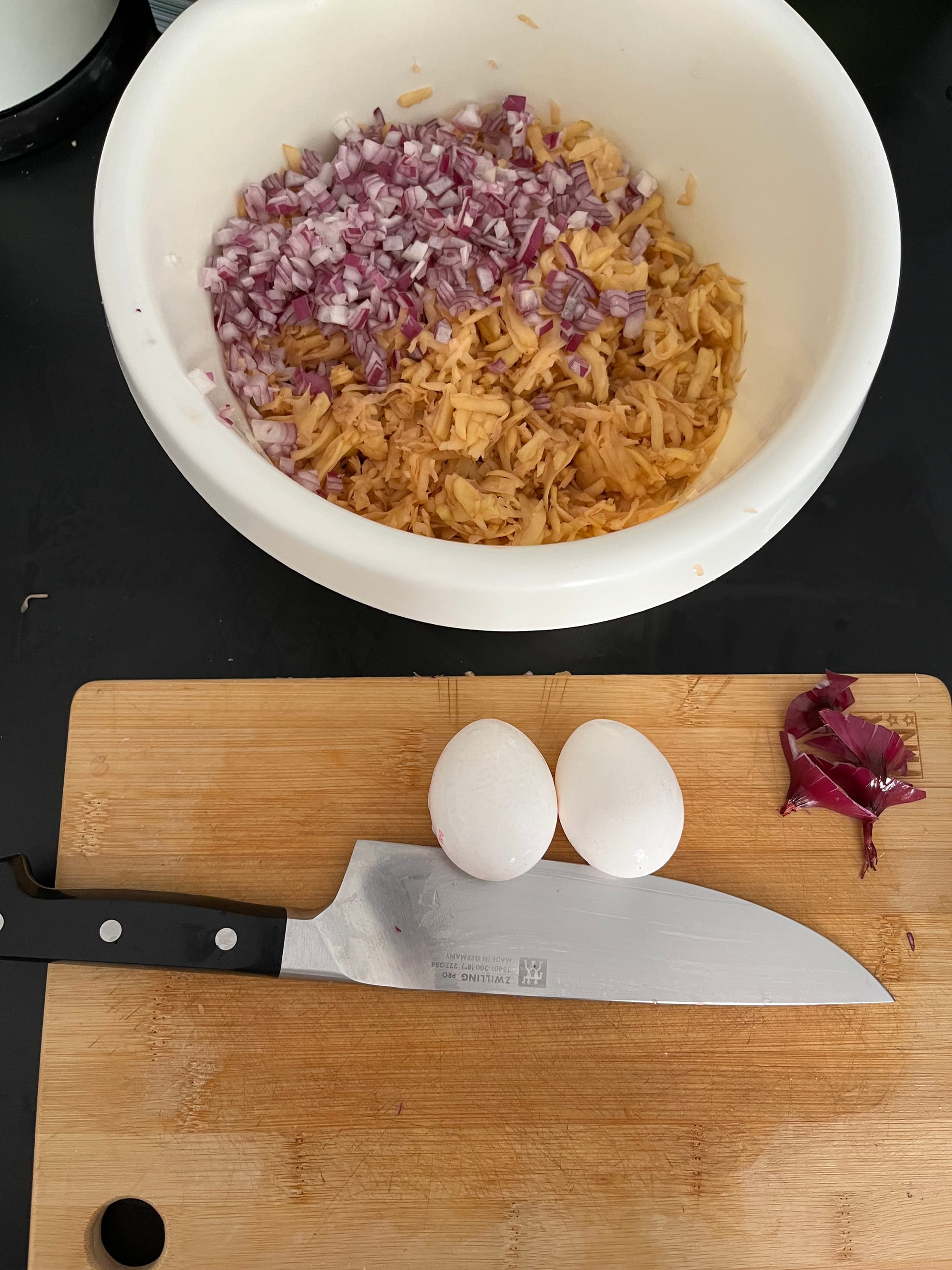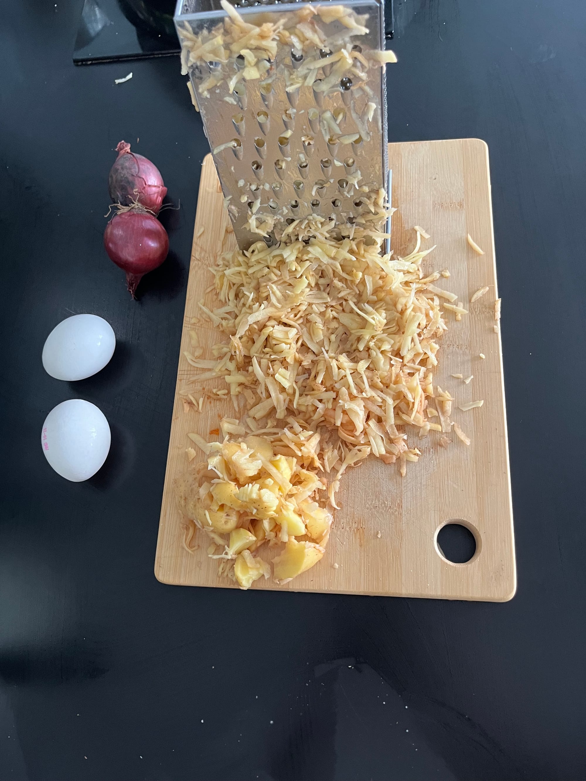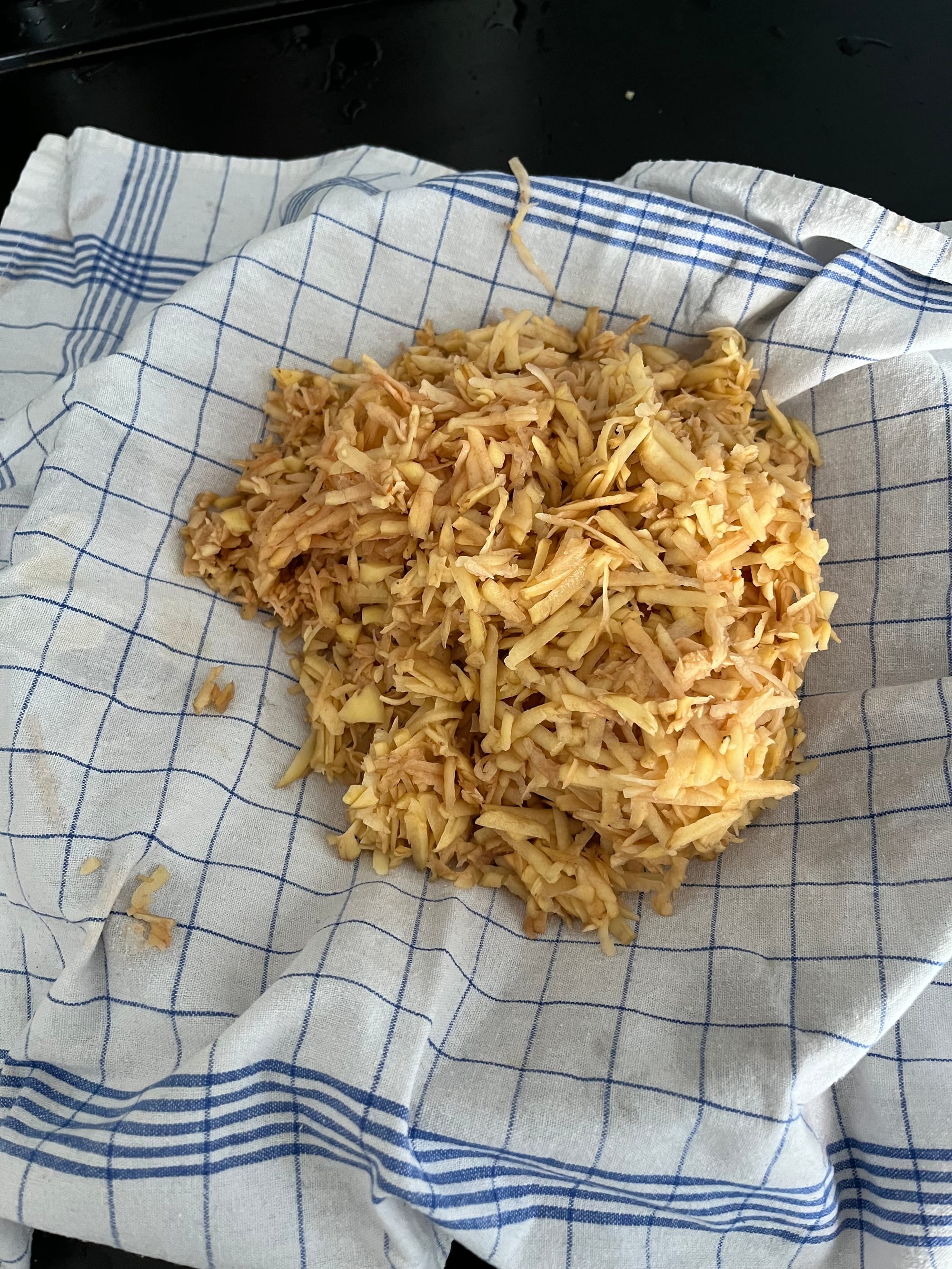 Zuerst werden die Kartoffeln relativ grob gerieben. Anschließend werden sie in ein frisches Geschirrtuch gepackt und ausgepresst. Achtet darauf, wirklich so viel Wasser wie möglich herauszudrücken, denn das macht die Puffer besonders knusprig. Danach werden die Eier, Zwiebeln, Salz und Pfeffer hinzugefügt. Die Kartoffelmasse forme ich zu Kugeln, die ich dann in der Pfanne flach drücke.