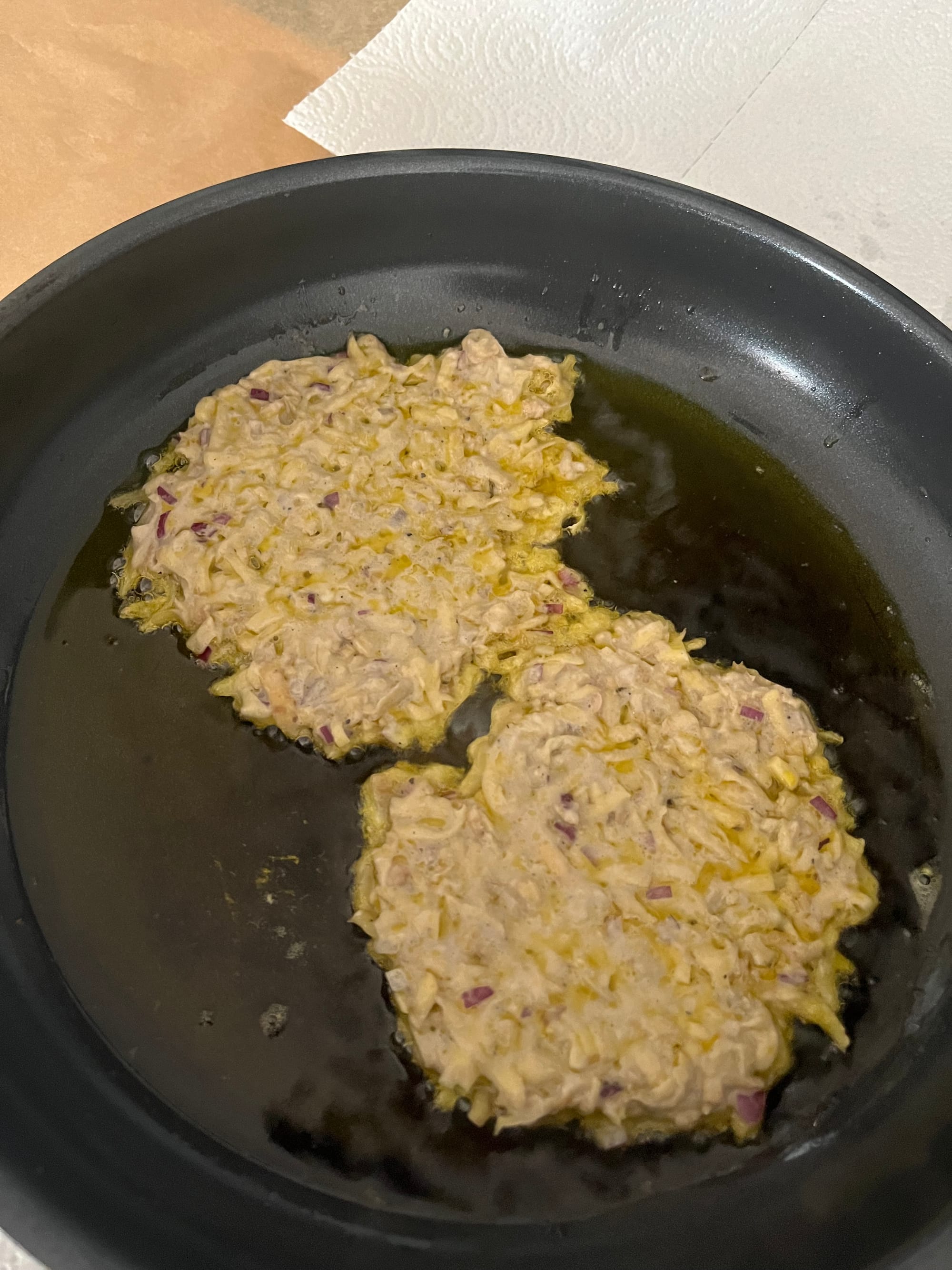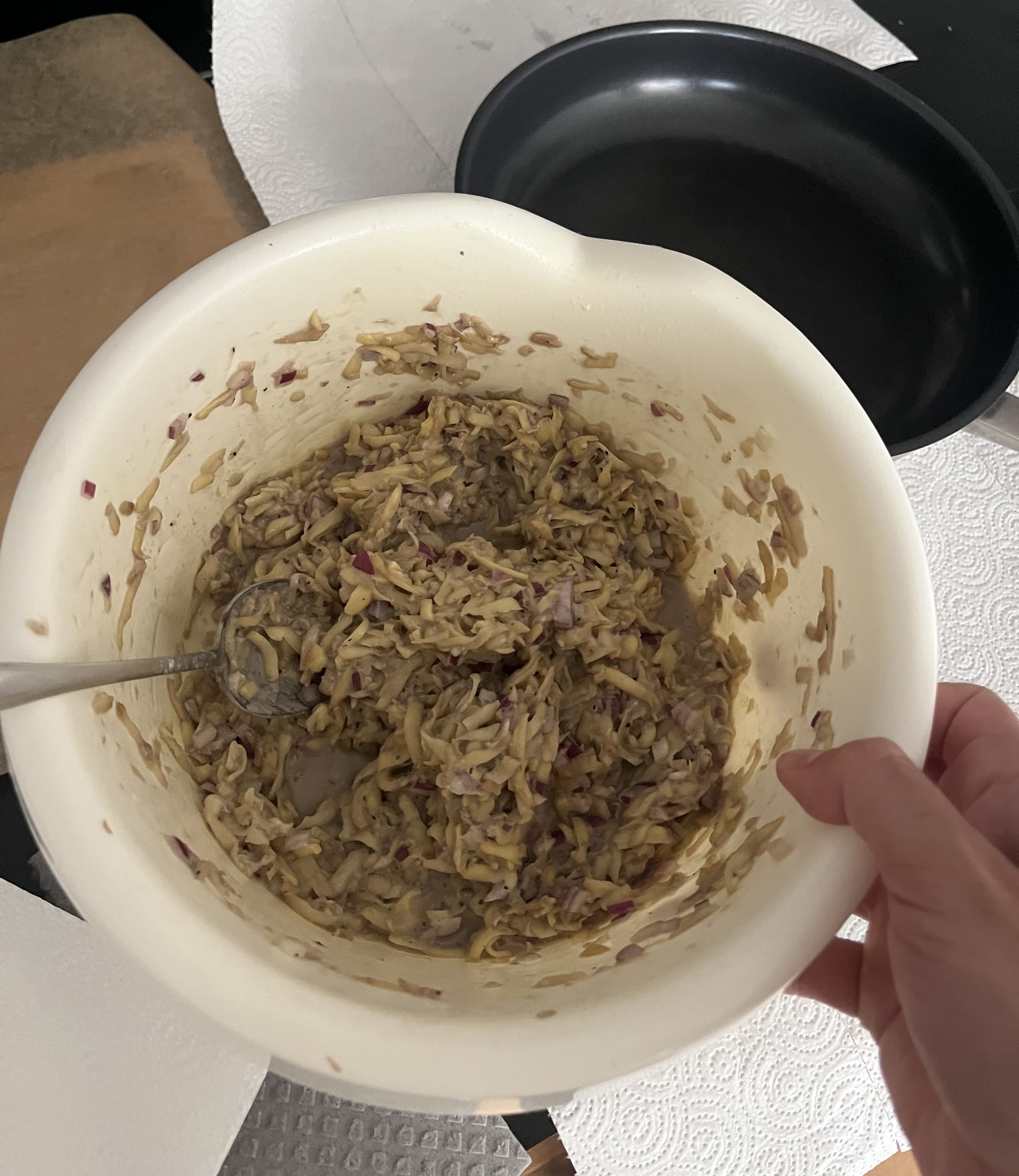 Dieses Rezept habe ich im Internet gefunden. Es war jedoch ähnlich wie zahlreiche andere, die ich bereits in Videos gesehen habe. Meine Mutter meinte zu mir, dass sie meistens auf Haferflocken und Kartoffelstampf zurückgreift – eine Alternative, die ich in Zukunft auch noch ausprobieren muss.