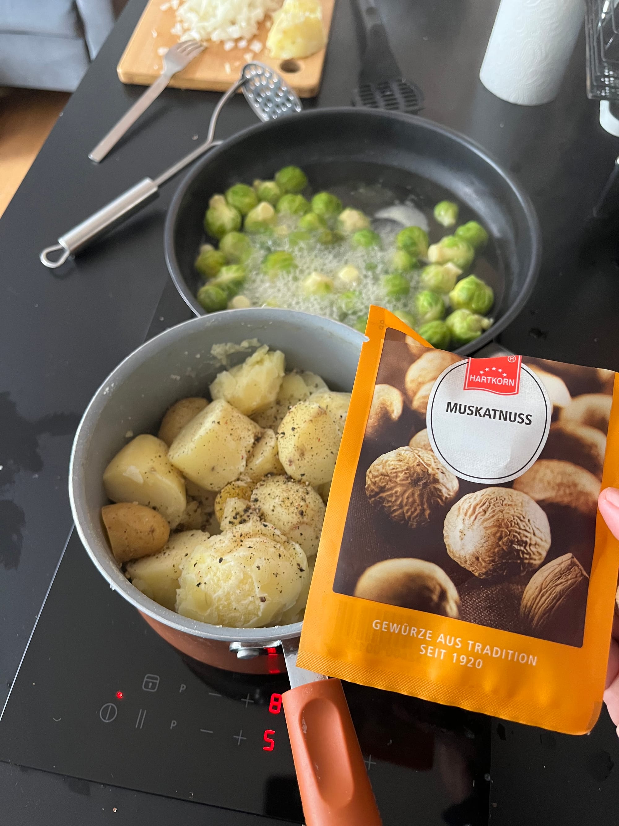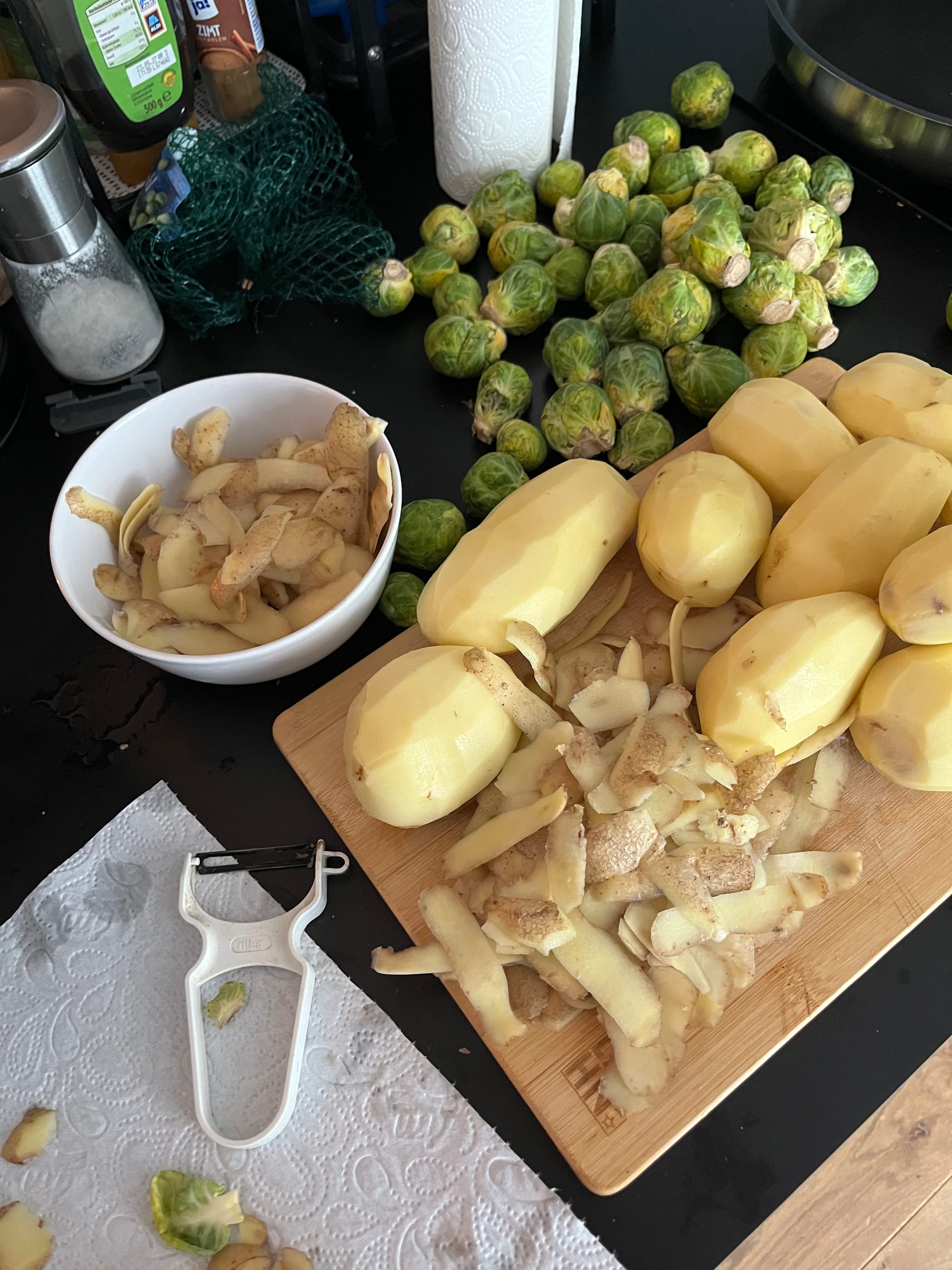 • Kartoffeln schälen (Schalen aufheben!), Rosenkohl halbieren, Zwiebel & Knoblauch klein schneiden.