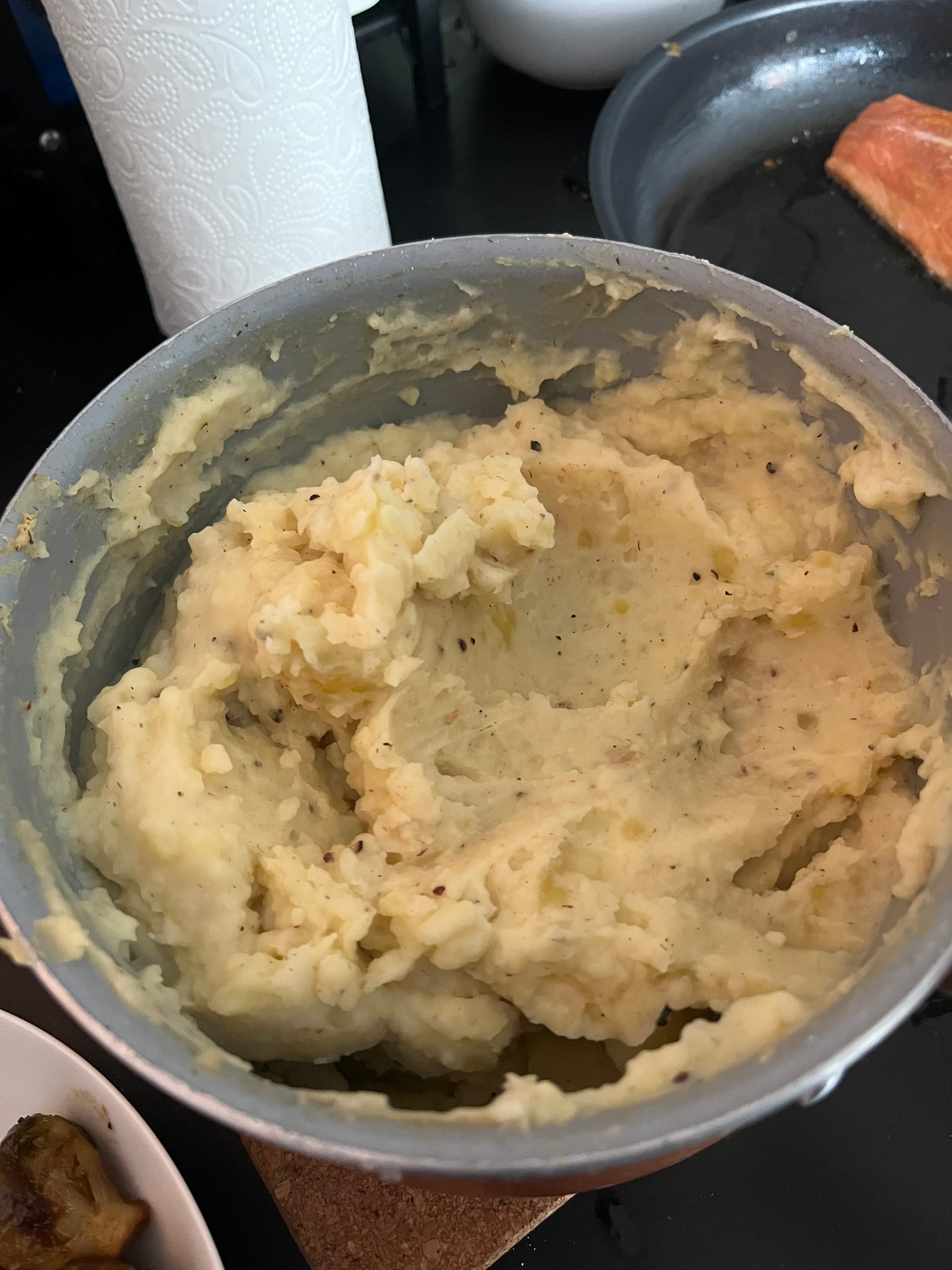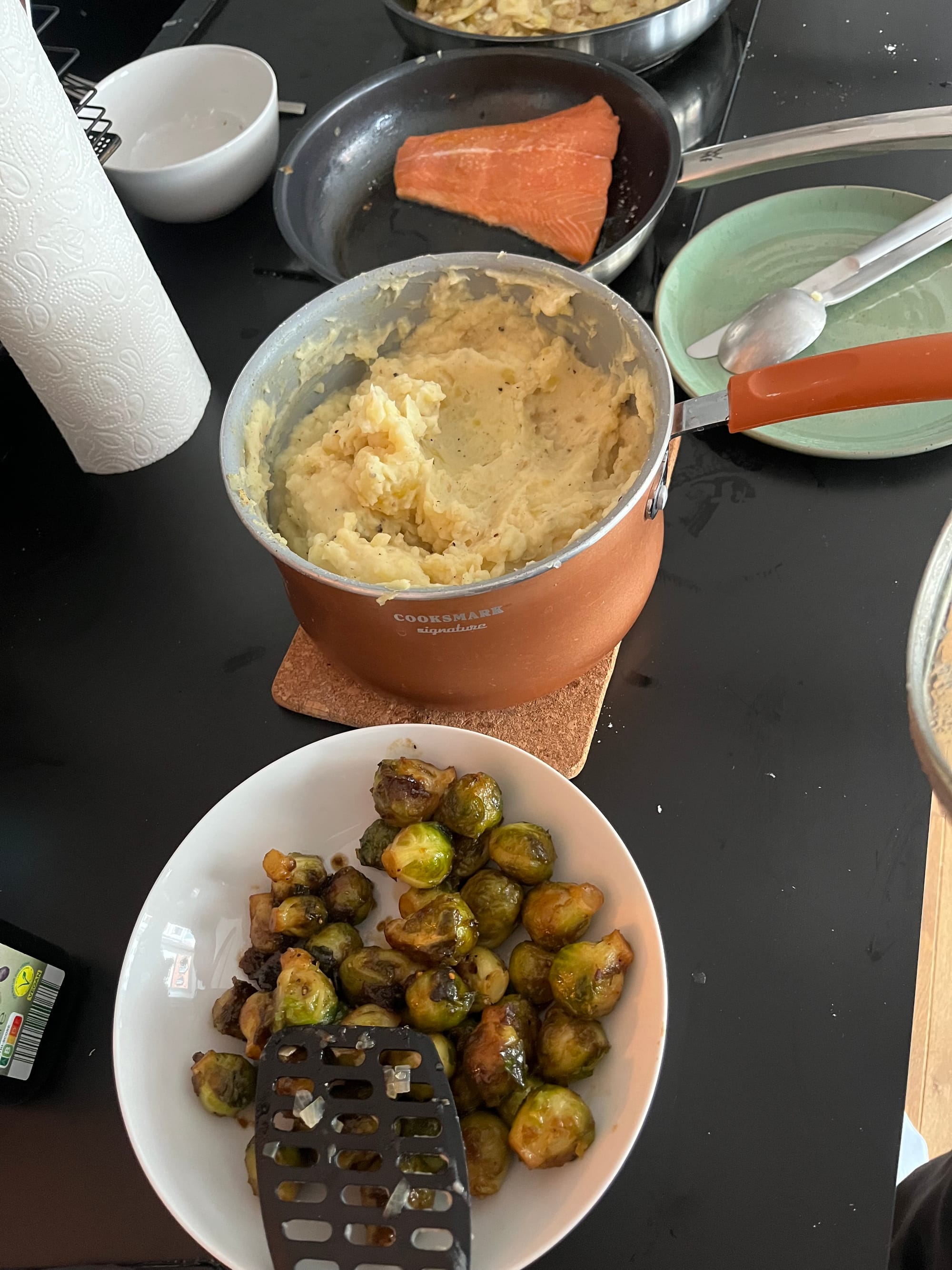Lachs, Kartoffelpüree und Rosenkohl