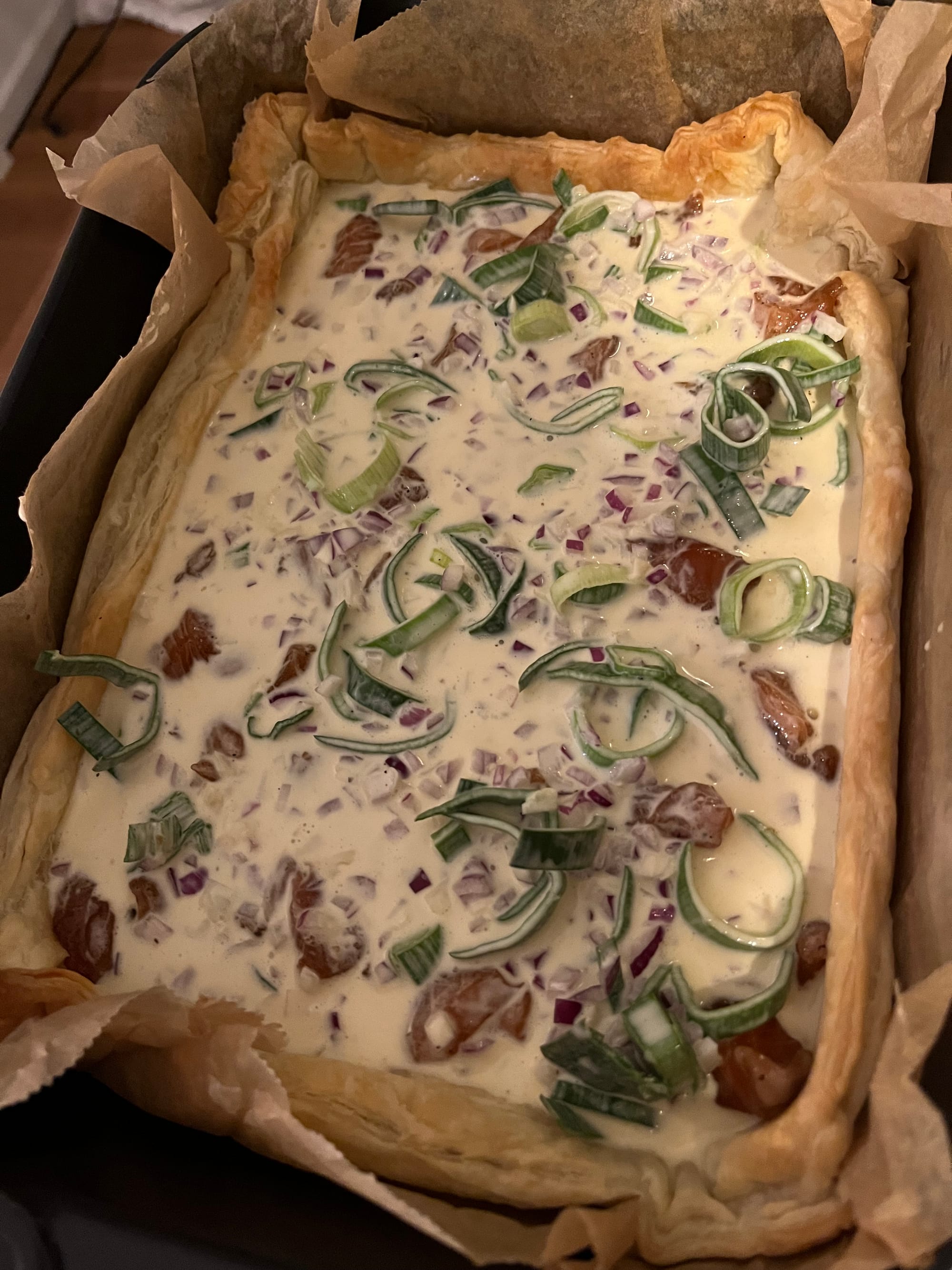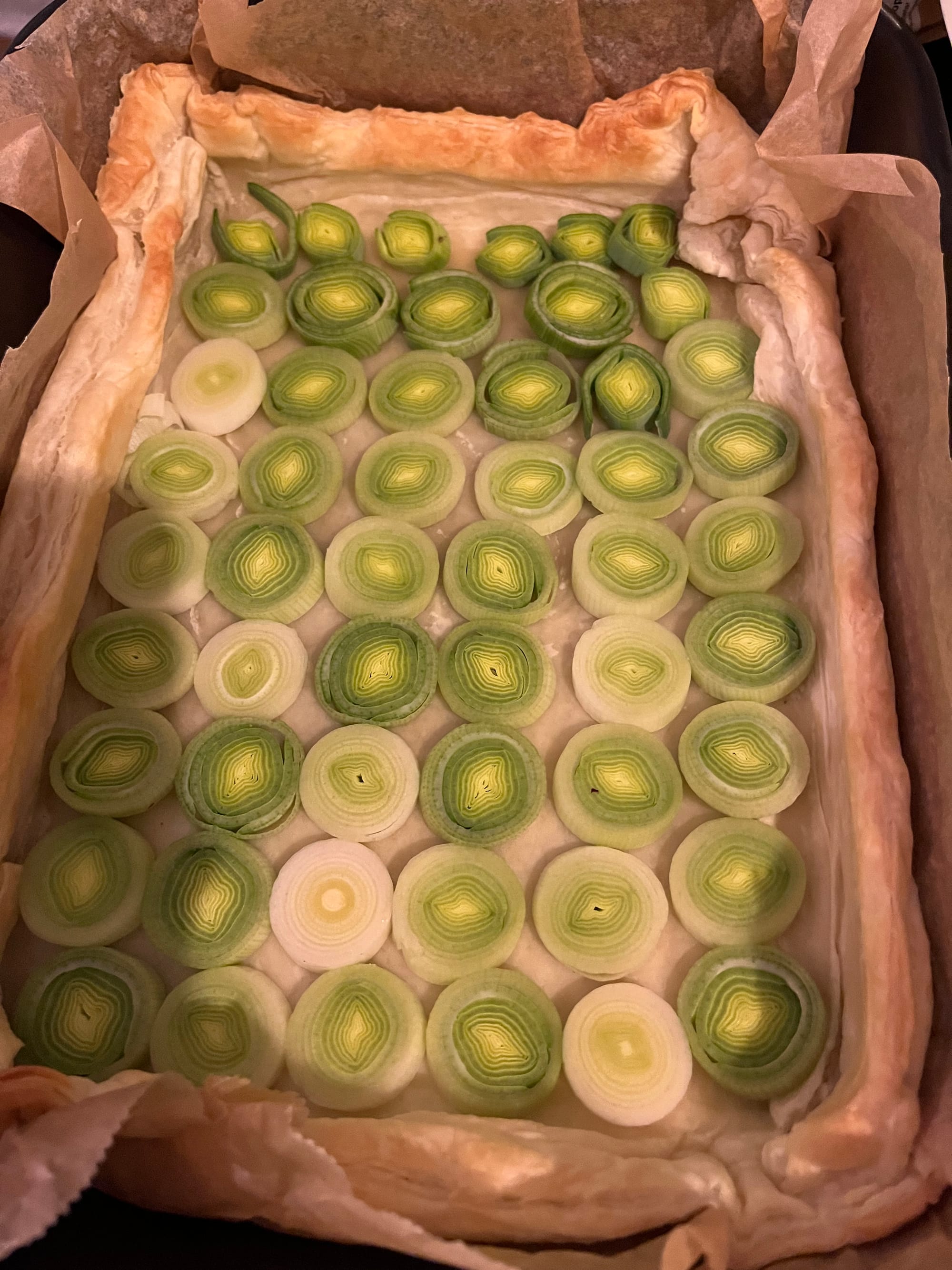 Die Hälfte des Lauchs direkt auf den Boden des Teigs verteilen – das sorgt für eine schöne Basis und schützt gleichzeitig den Boden etwas vor Durchweichen. - Füllung einschichten.