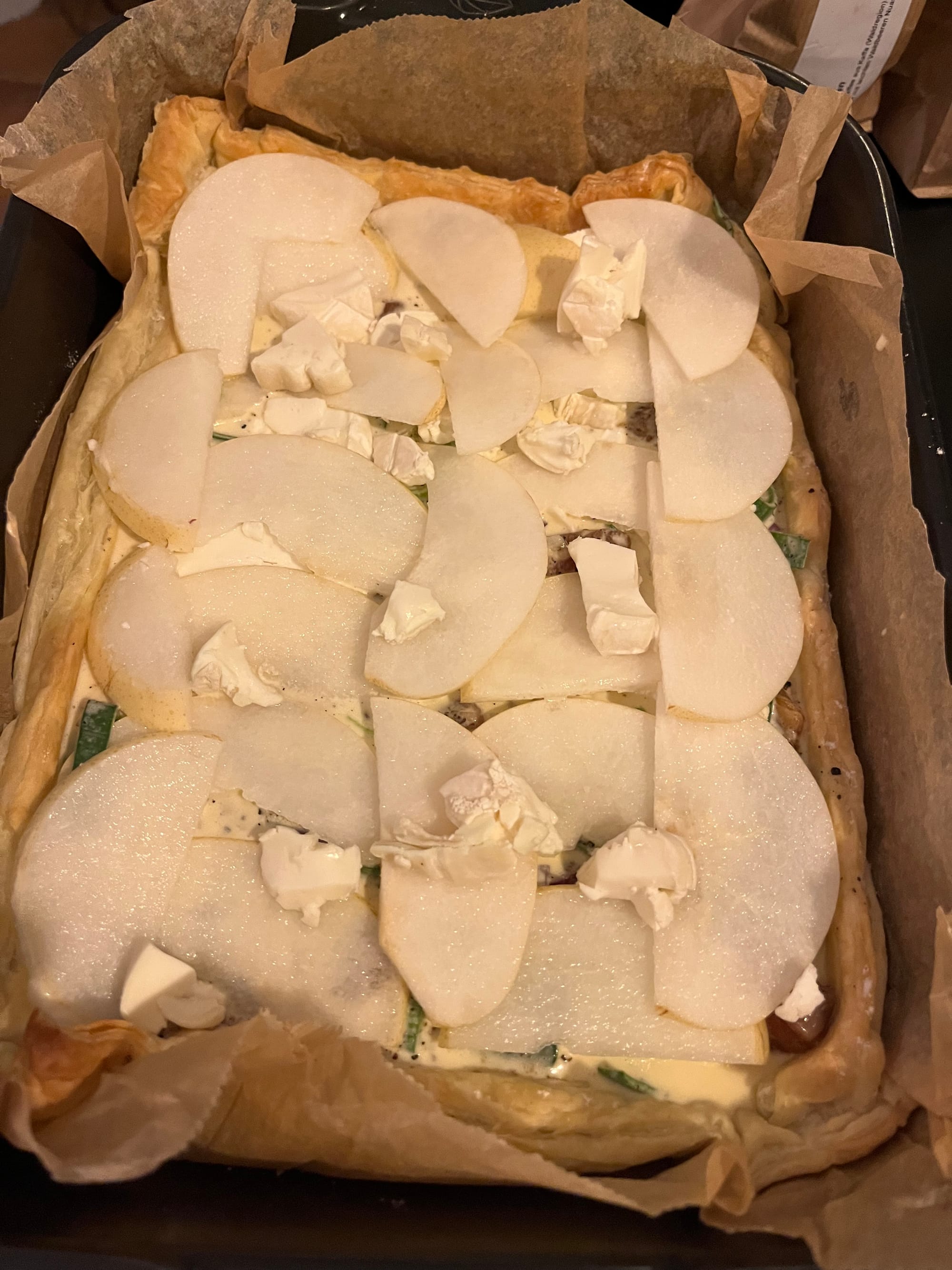 Nun die marinierten Lachsstücke (abgetropft), Birnenscheiben, restlichen Lauch, Zwiebel, Knoblauch und Rosmarin gleichmäßig auf dem Teig verteilen. - Sauce darüber gießen.