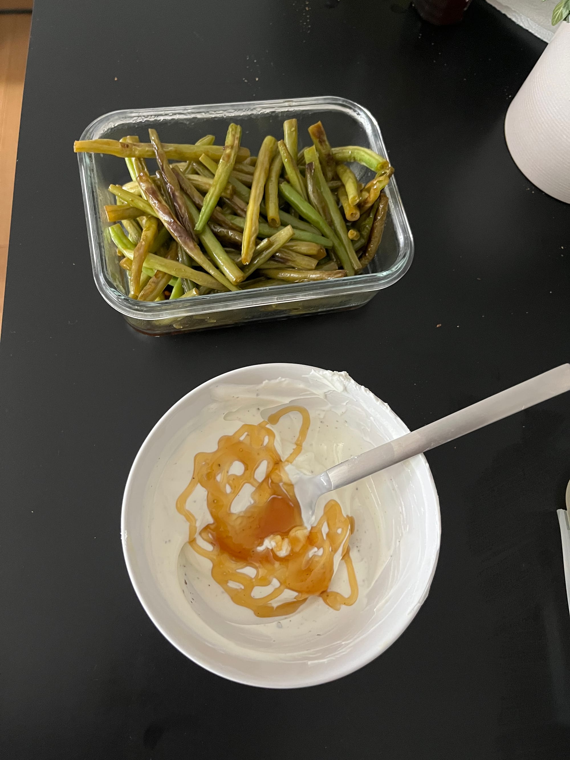 - Sauce anrühren: Joghurt, Tahin, Honig, Zitronensaft und Salz gut verrühren, bis eine glatte, leicht dickflüssige Sauce entsteht.