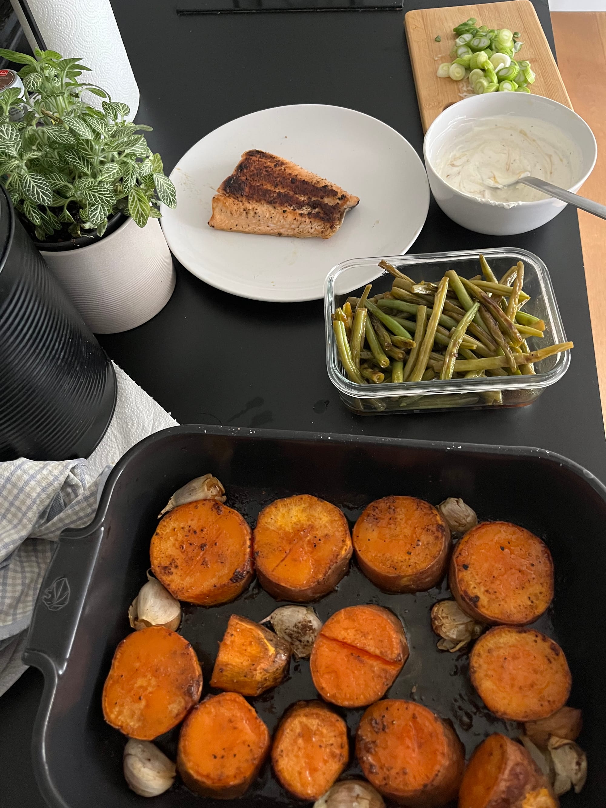 Auf der Suche nach einem Gericht, welches mit frischen Aromen überrascht und dabei ausgewogen ist, bin ich über diesen Genuss gestolpert. Der zarte, jedoch knusprig angebratene Fisch, mit süßlichen Bohnen und sehr knoblauch-lastigen Süßkartoffeln, einschließlich der Sauce, führen zu einem harmonischen und trotzdem sehr sättigenden Essen. Perfekt für ein entspanntes Abendessen.