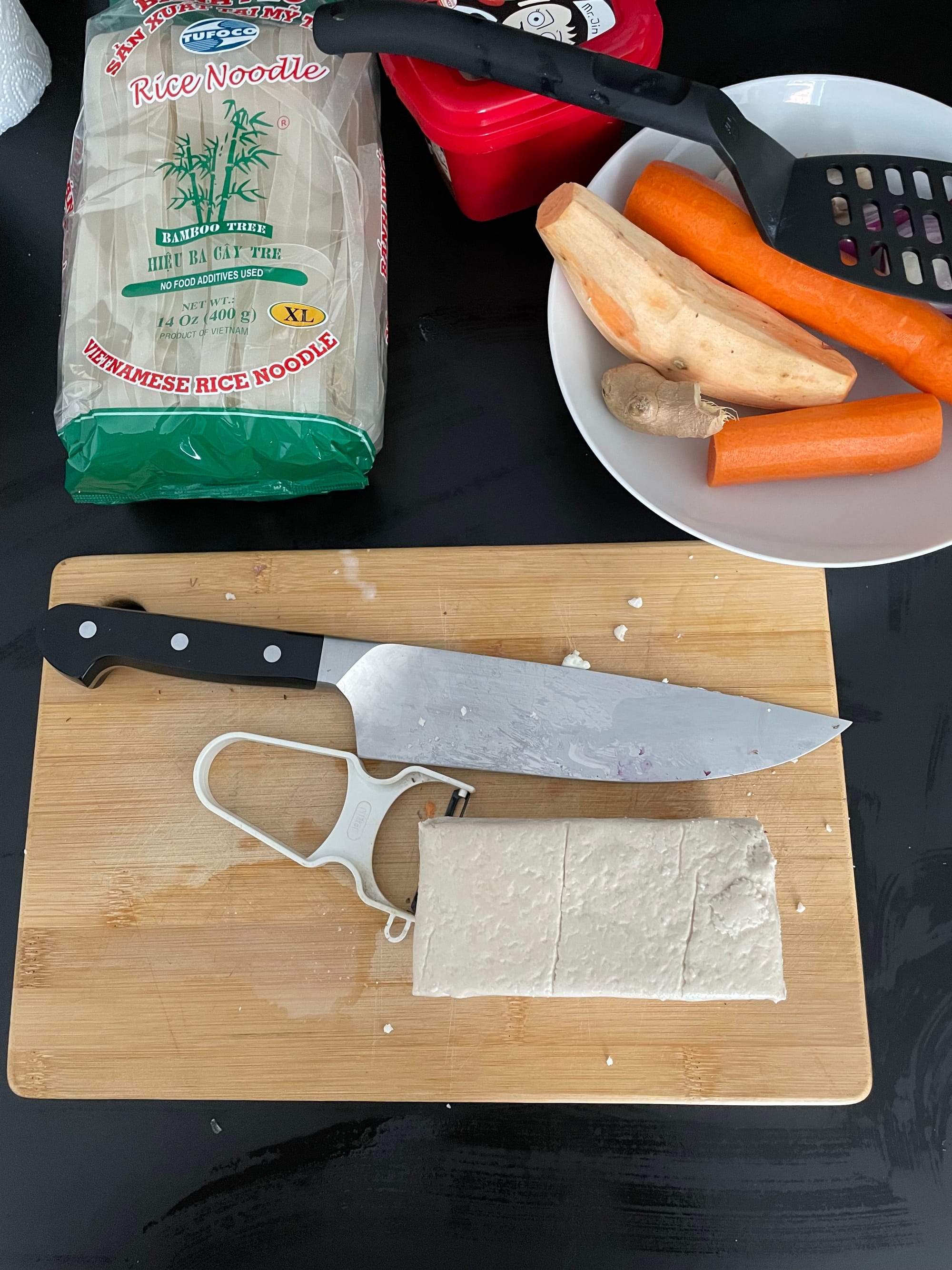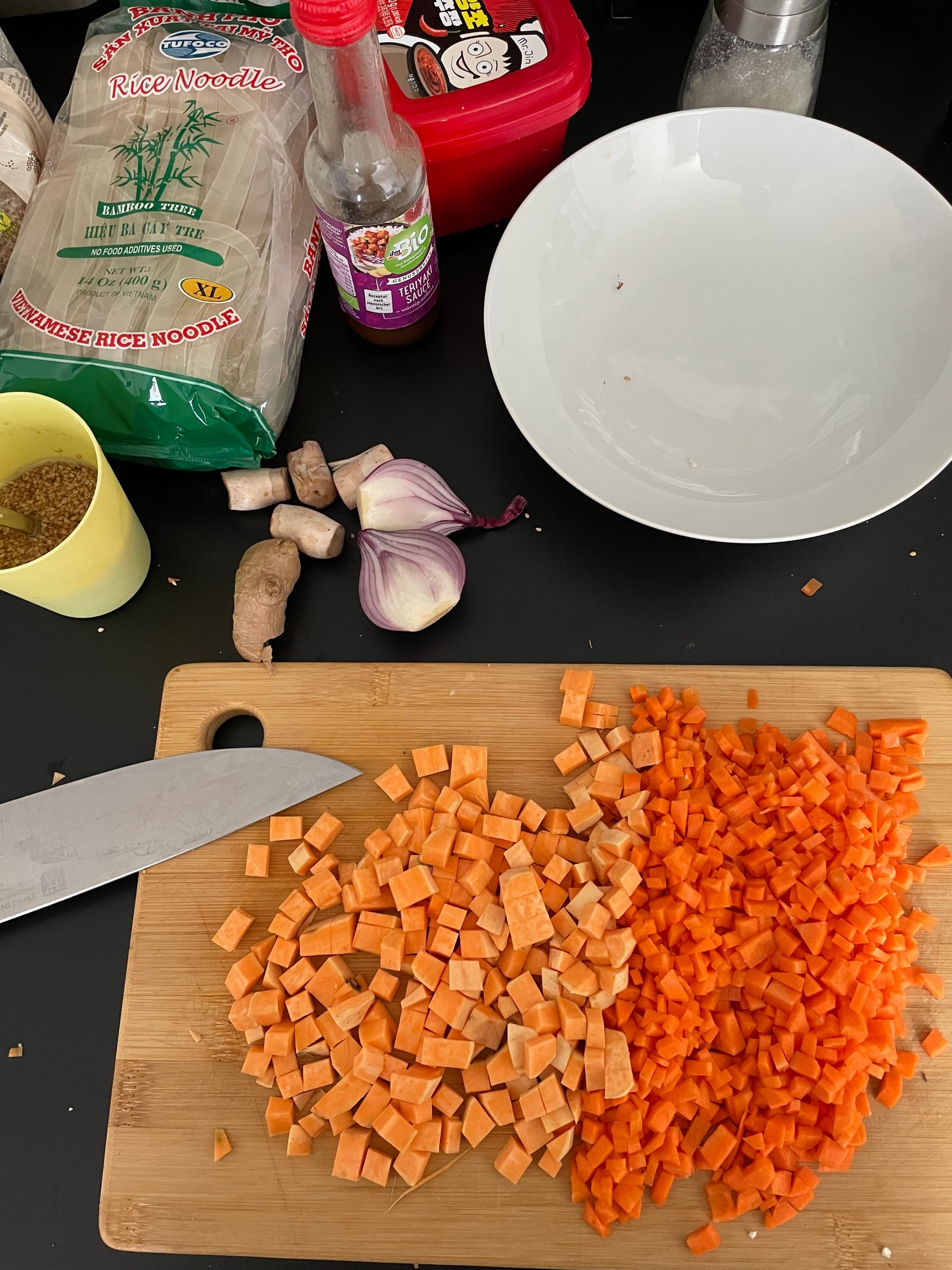 - Gemüse vorbereiten: Knoblauch, Ingwer, Zwiebeln, Frühlingszwiebeln, Karotten und Süßkartoffel klein schneiden.