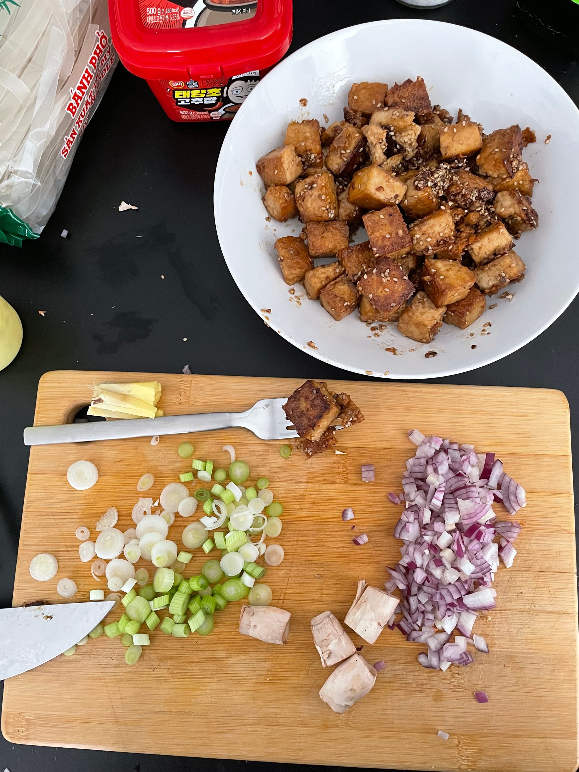- Tofu in Würfel schneiden, mit Sojasauce, Sesamöl, braunem Zucker, Gochujang und Fischsauce vermengen. Beiseitestellen und ziehen lassen.