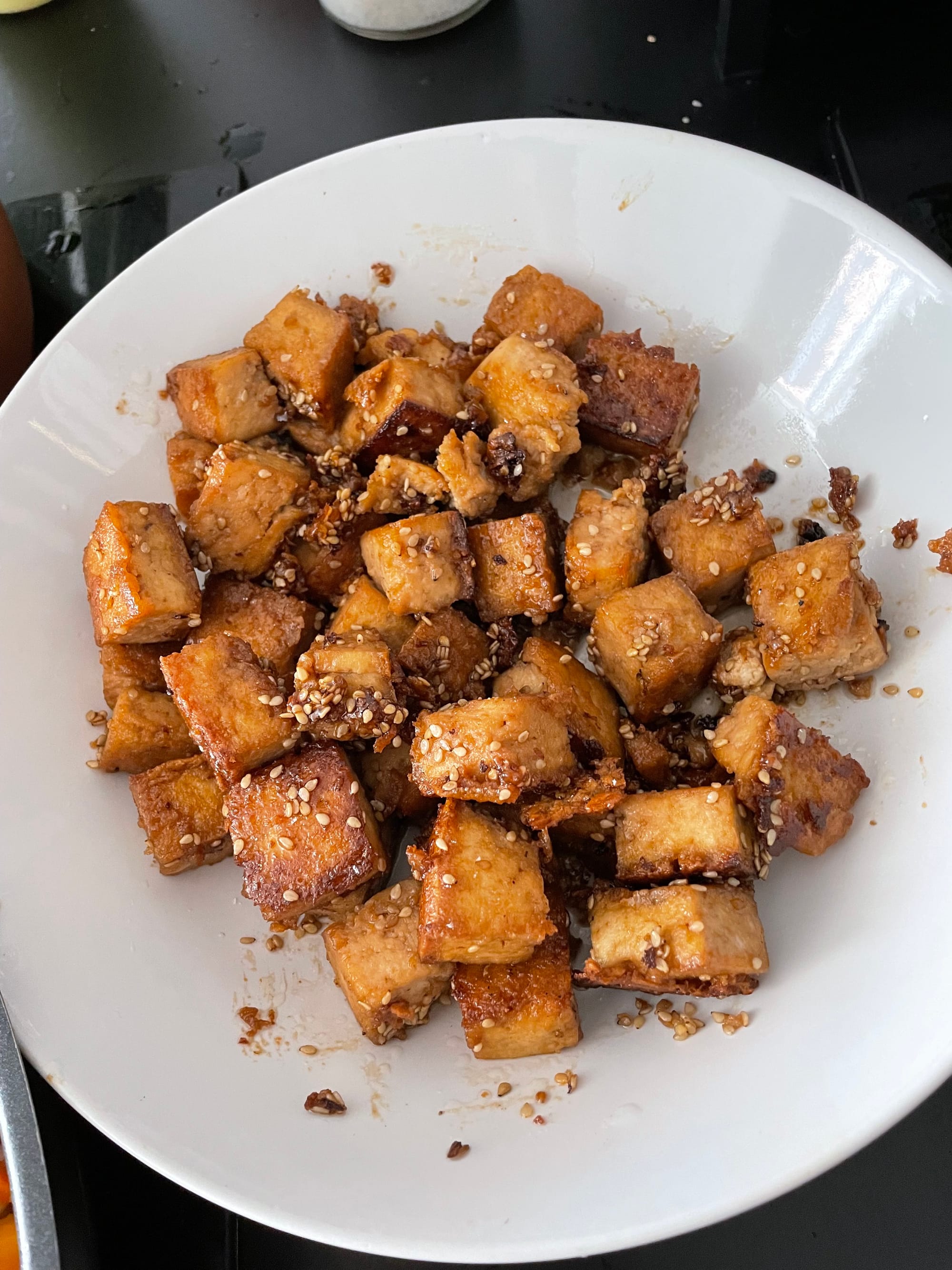 - Eingelegten Tofu in einer zweiten Pfanne oder am Rand mitbraten, bis er leicht knusprig ist.