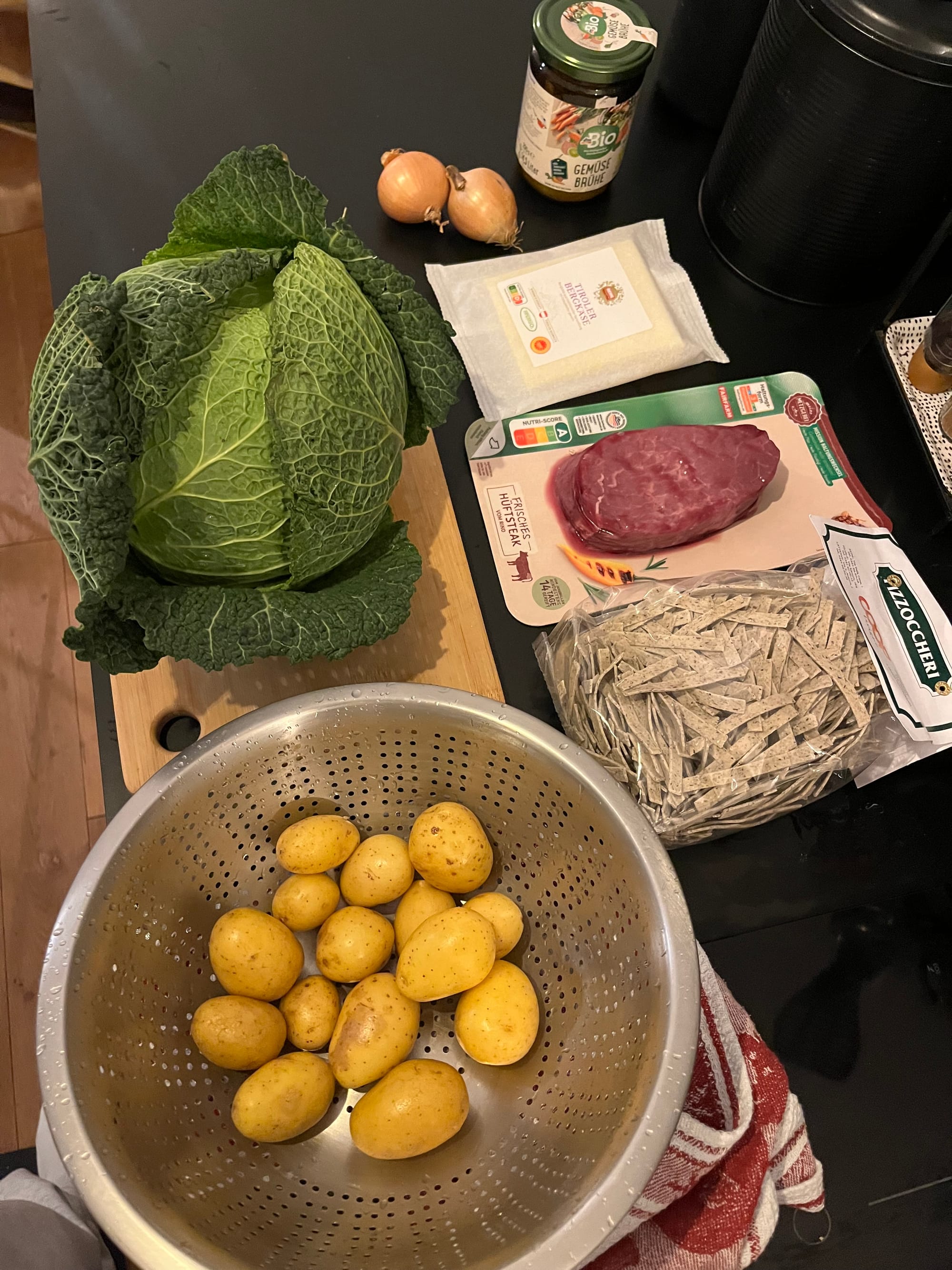 Meine Familie und ich haben diese tolle Kost in Livigno entdeckt. Meiner Schätzung nach wurde sie dort schon in vergangenen Jahrhunderten von den Italienern gegessen – ähnlich wie Pizza oder andere einfache Gerichte – als Resteverwertung und vor allem als Stärkung in den kalten Wintermonaten. Der Wirsing sorgt für einen wunderbaren Umami-Geschmack, die Kartoffeln lassen das deutsche Herz höher schlagen und die deftigen Weizennudeln haben genau die richtige Textur, um zusammen mit dem Bergkäse eine perfekte Cremigkeit zu erreichen.