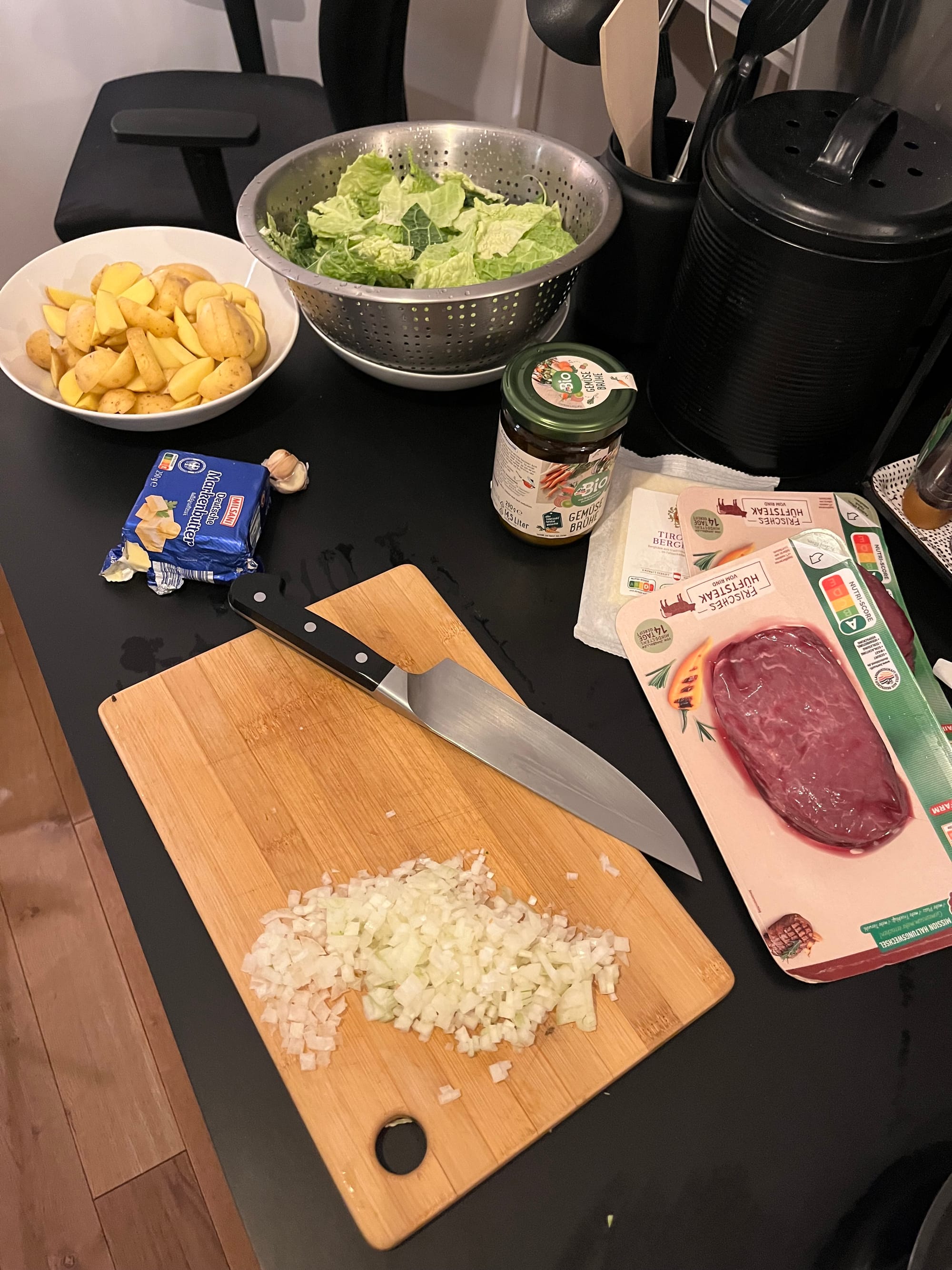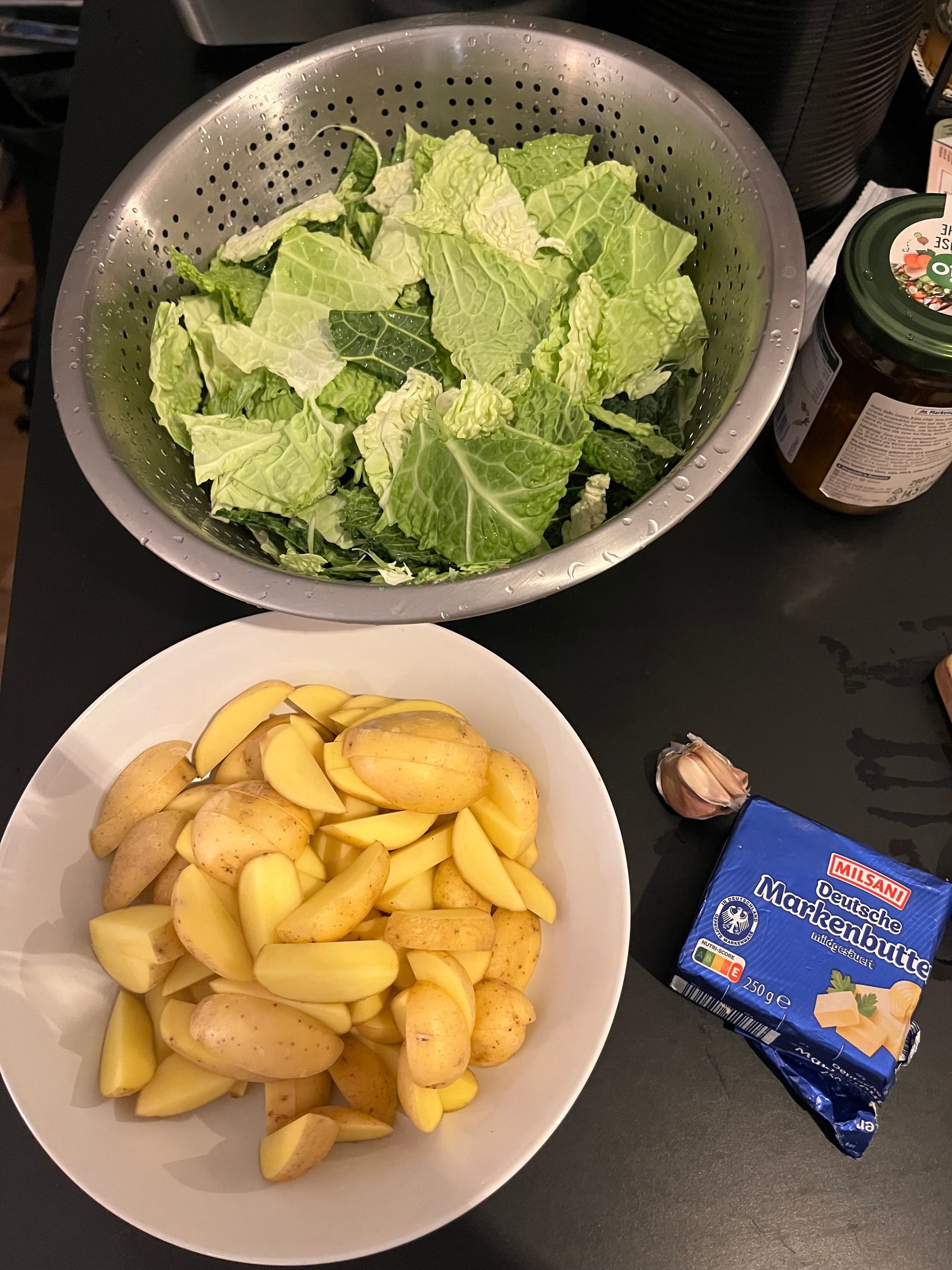 - Kartoffeln schälen und in mundgerechte Stücke schneiden, Wirsing grob schneiden, Zwiebeln in Streifen schneiden und Knoblauch fein hacken.