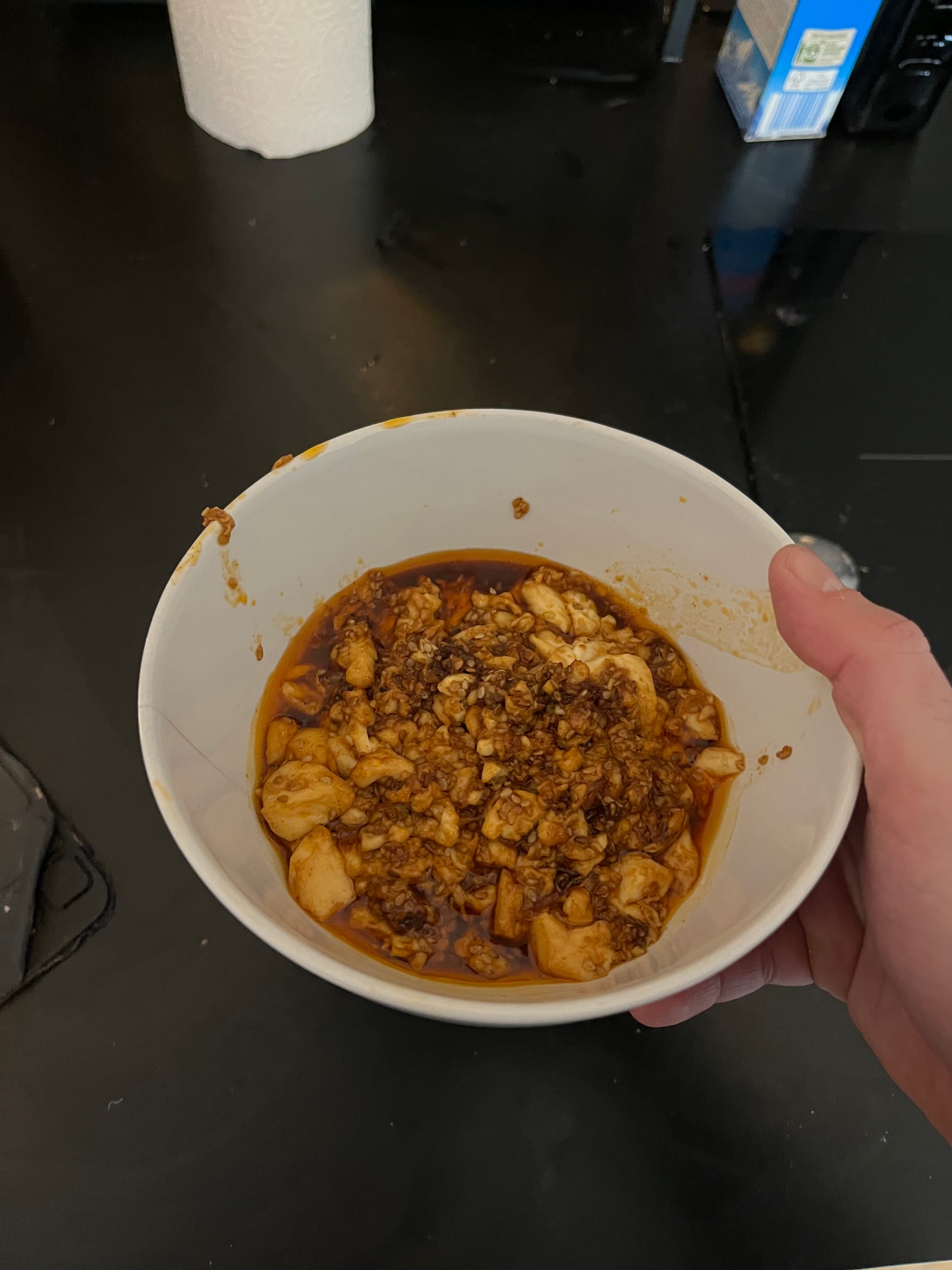 Die restliche Sauce über die Reispfanne geben, gut vermengen und kurz einkochen lassen. Zum Schluss den Tofu unterheben oder separat auf der Reispfanne servieren.