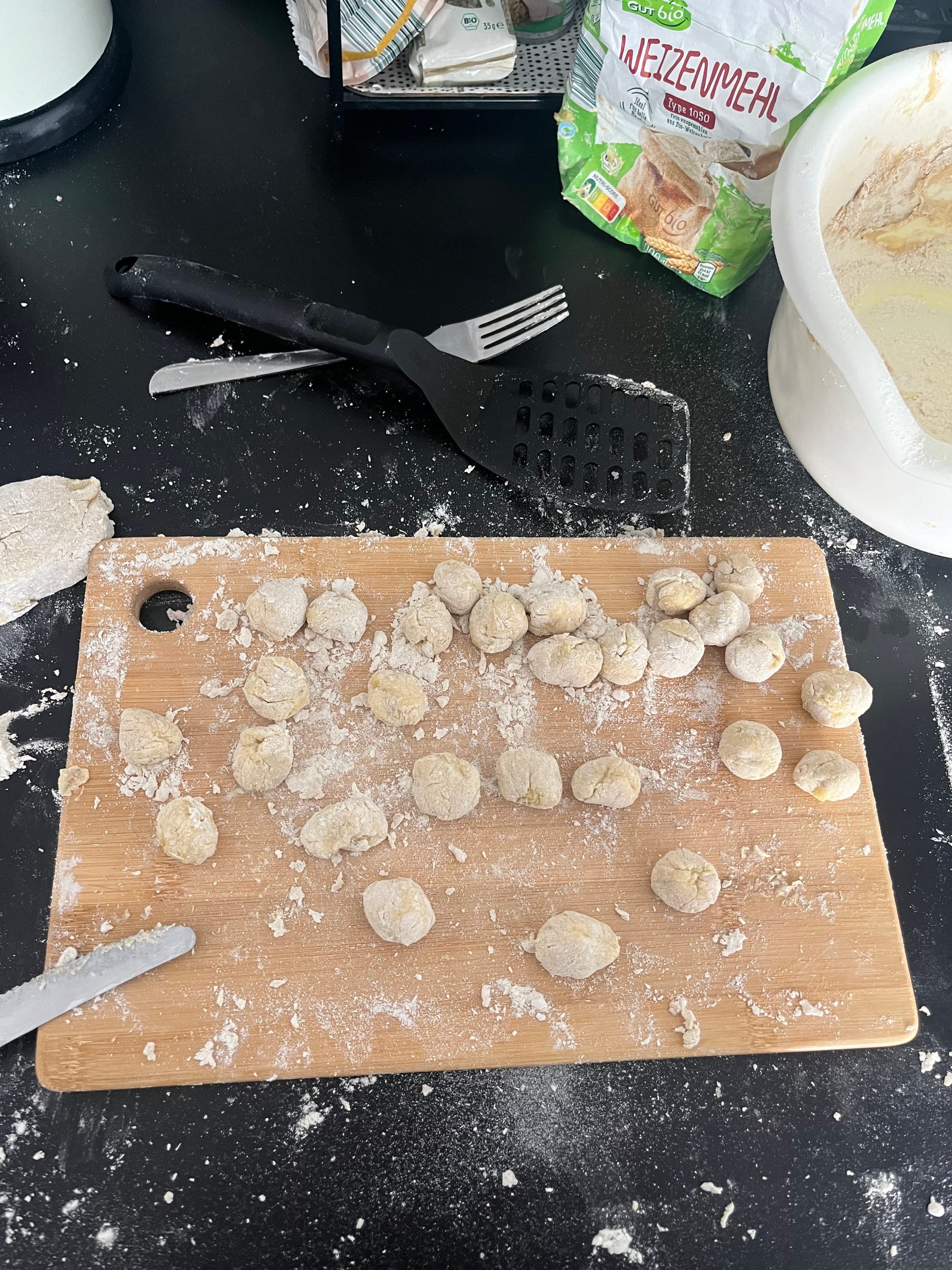Am Wochenende hatte ich meine Freunde Lukas und Lennart eingeladen, und wir hatten geplant, frische Gnocchi mit Salbei aus dem Garten meines Kumpels zuzubereiten. Leider haben wir den Salbei vergessen, und so wollten wir die Gnocchi nicht machen. Das Vorhaben ließ mich aber nicht los, und ich musste es nun endlich umsetzen.