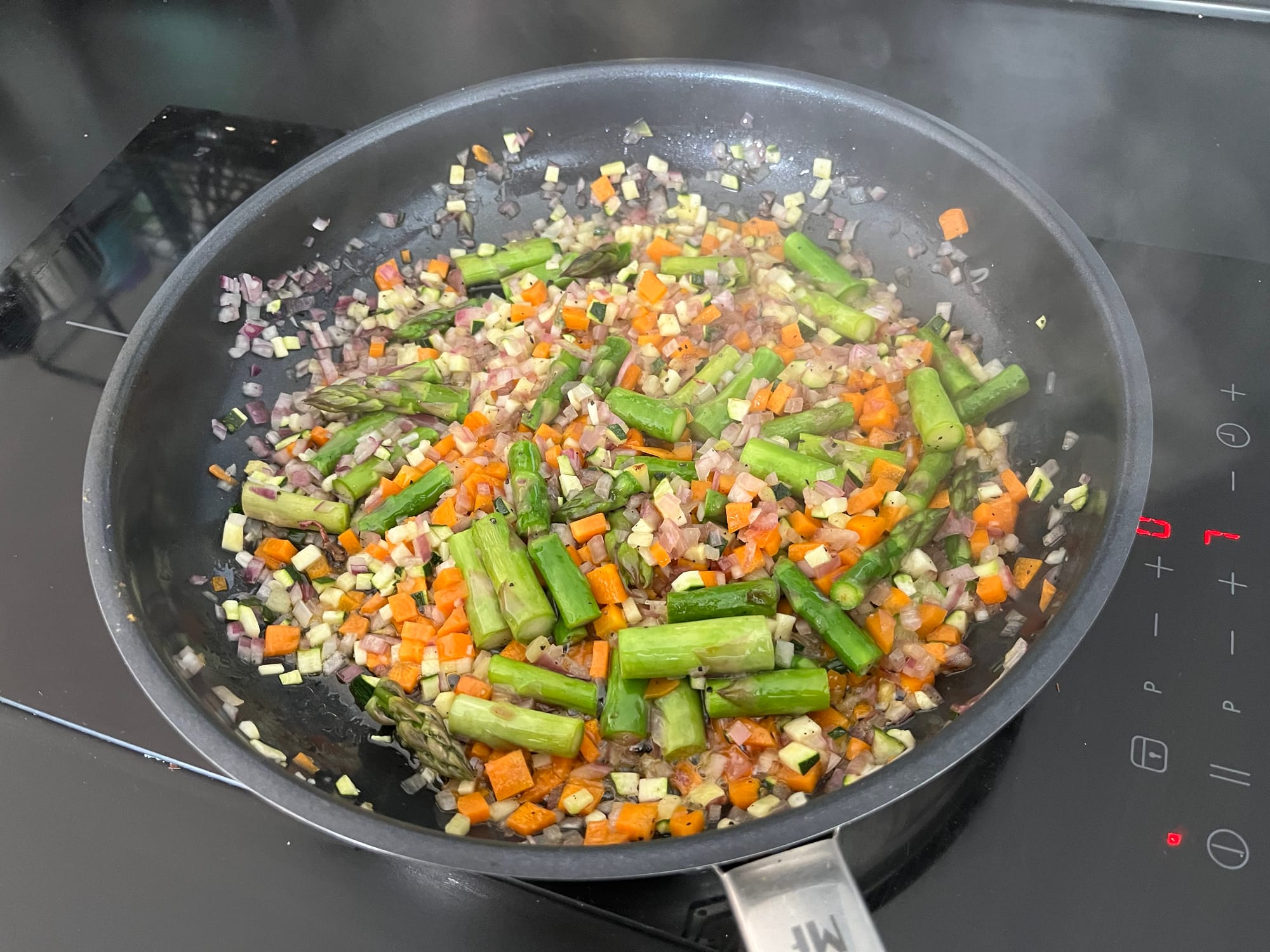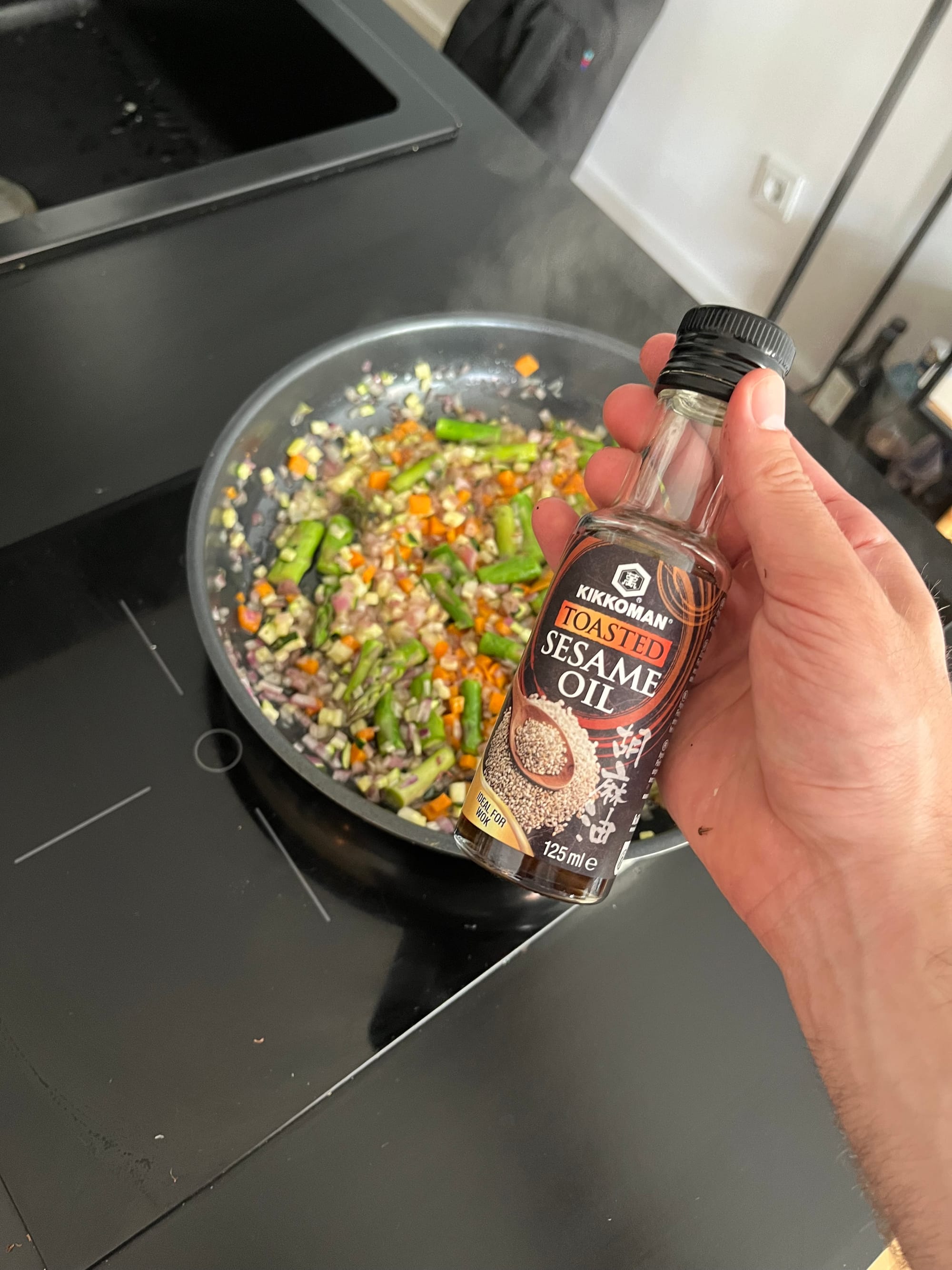 Karotten sowie das restliche Gemüse fein würfeln. (Zucchini war optional von mir verwendet.) Karotten zuerst anbraten, später Zwiebeln, Pilze und Spargel hinzugeben. Das Gemüse würzen, Ingwer und Knoblauch hinzufügen und in Sesamöl anbraten.