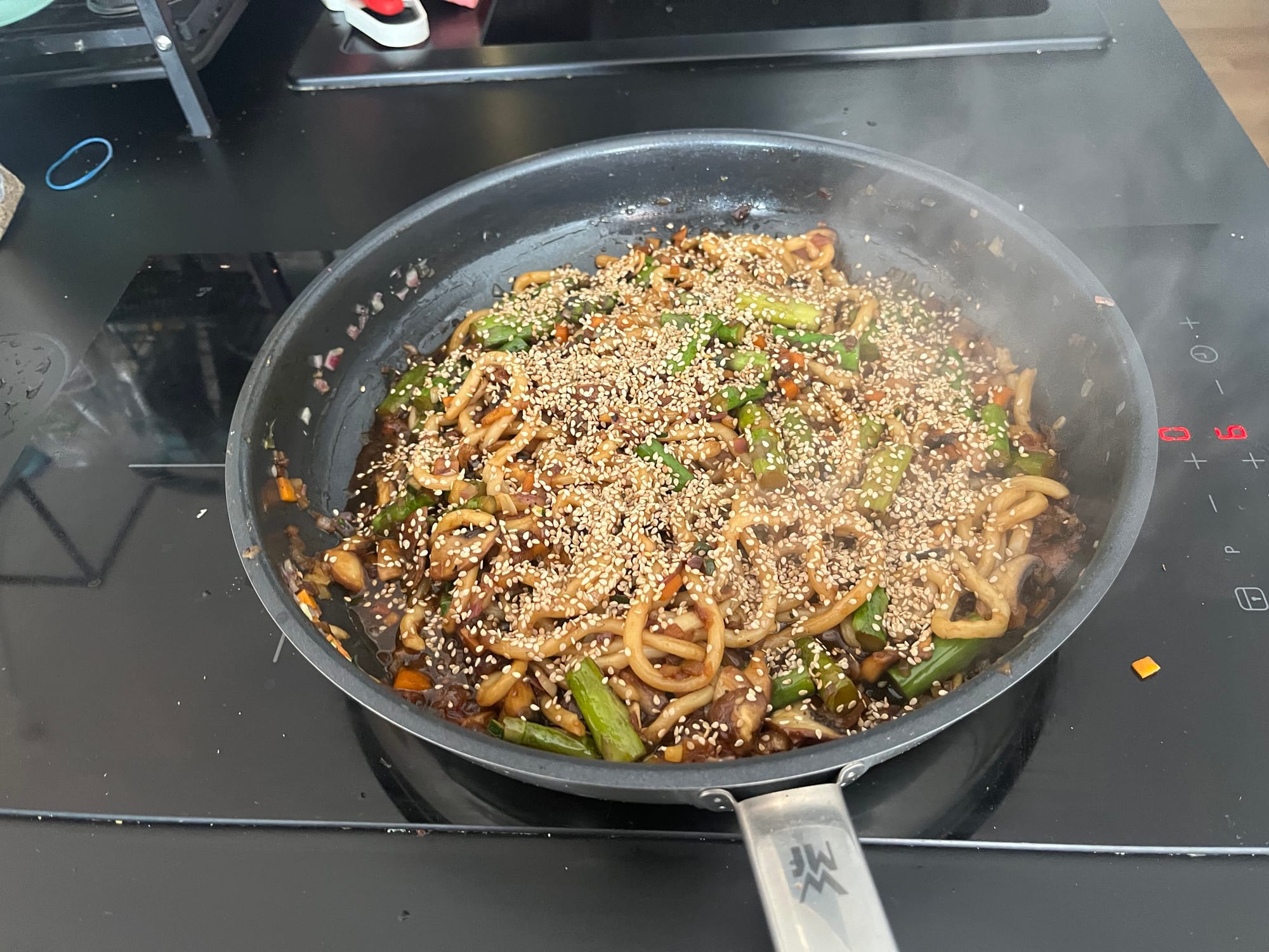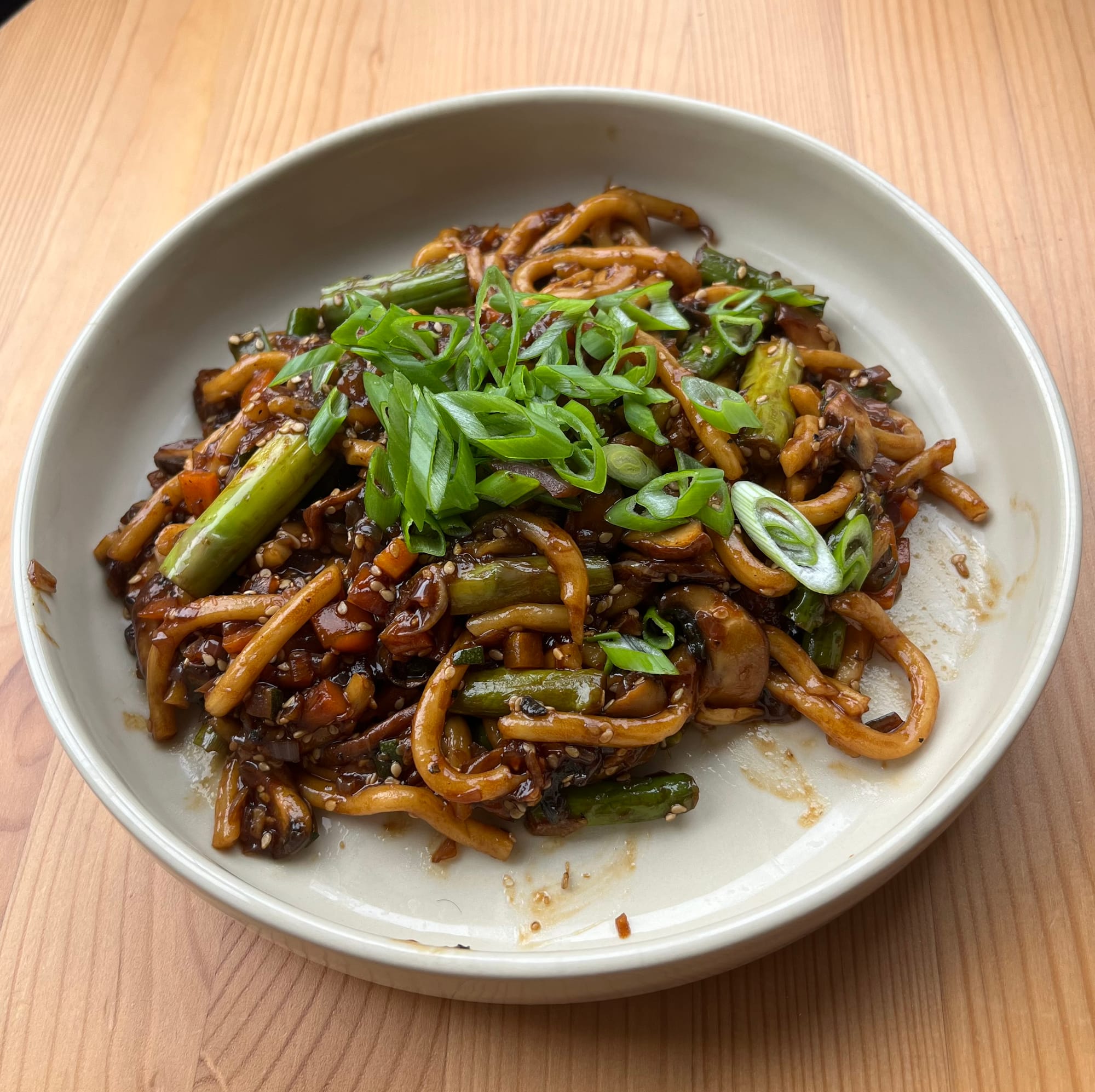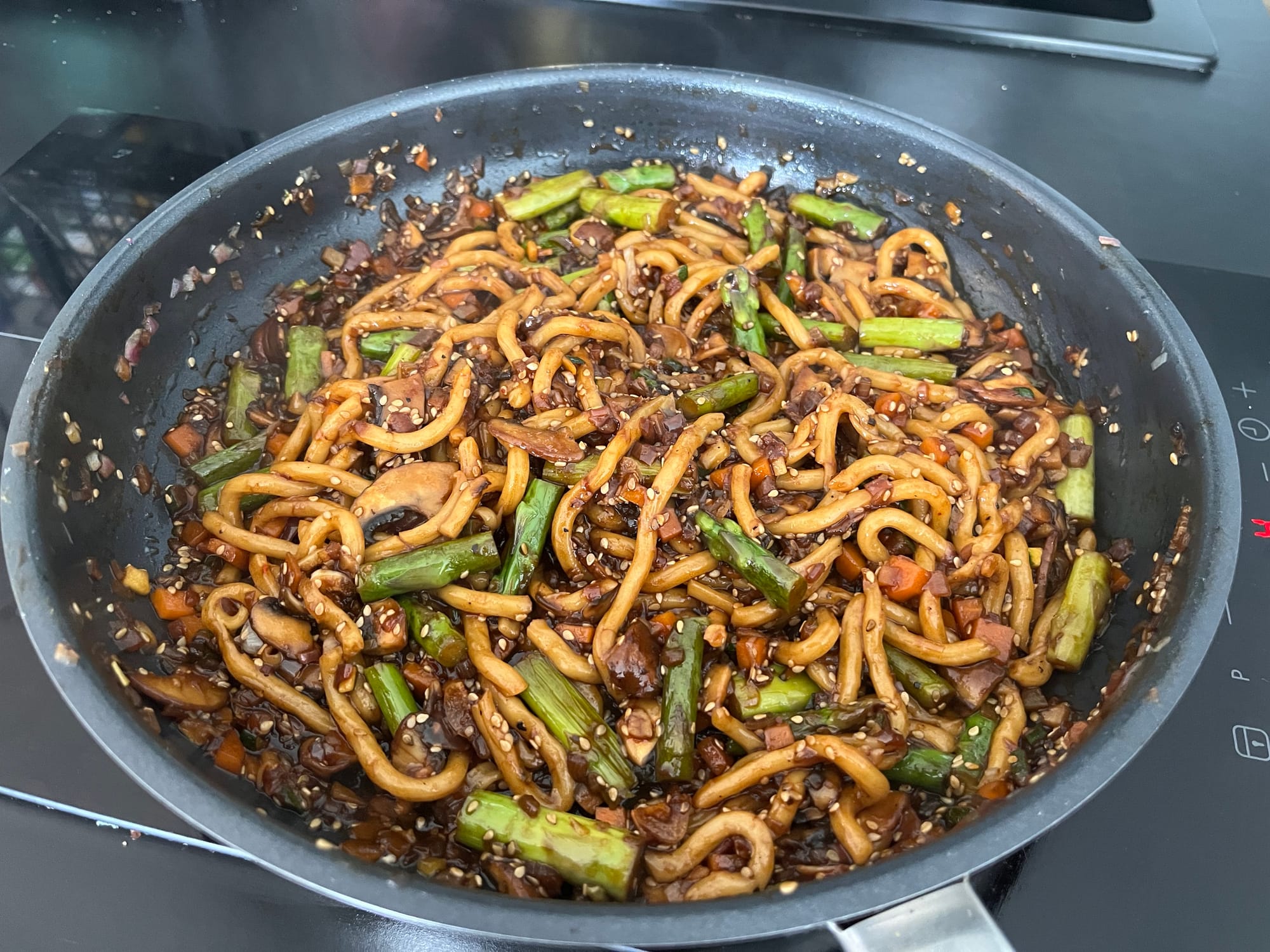 Udon Nudeln mit Spargel und Soya-Sesam Sauce
